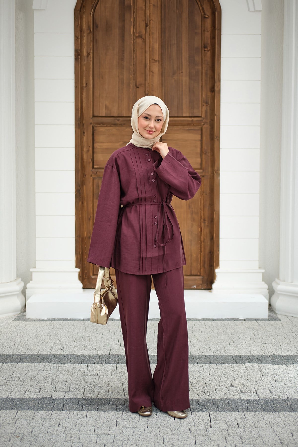 Büzgü Detay Bel Bağlamalı Takım Bordo