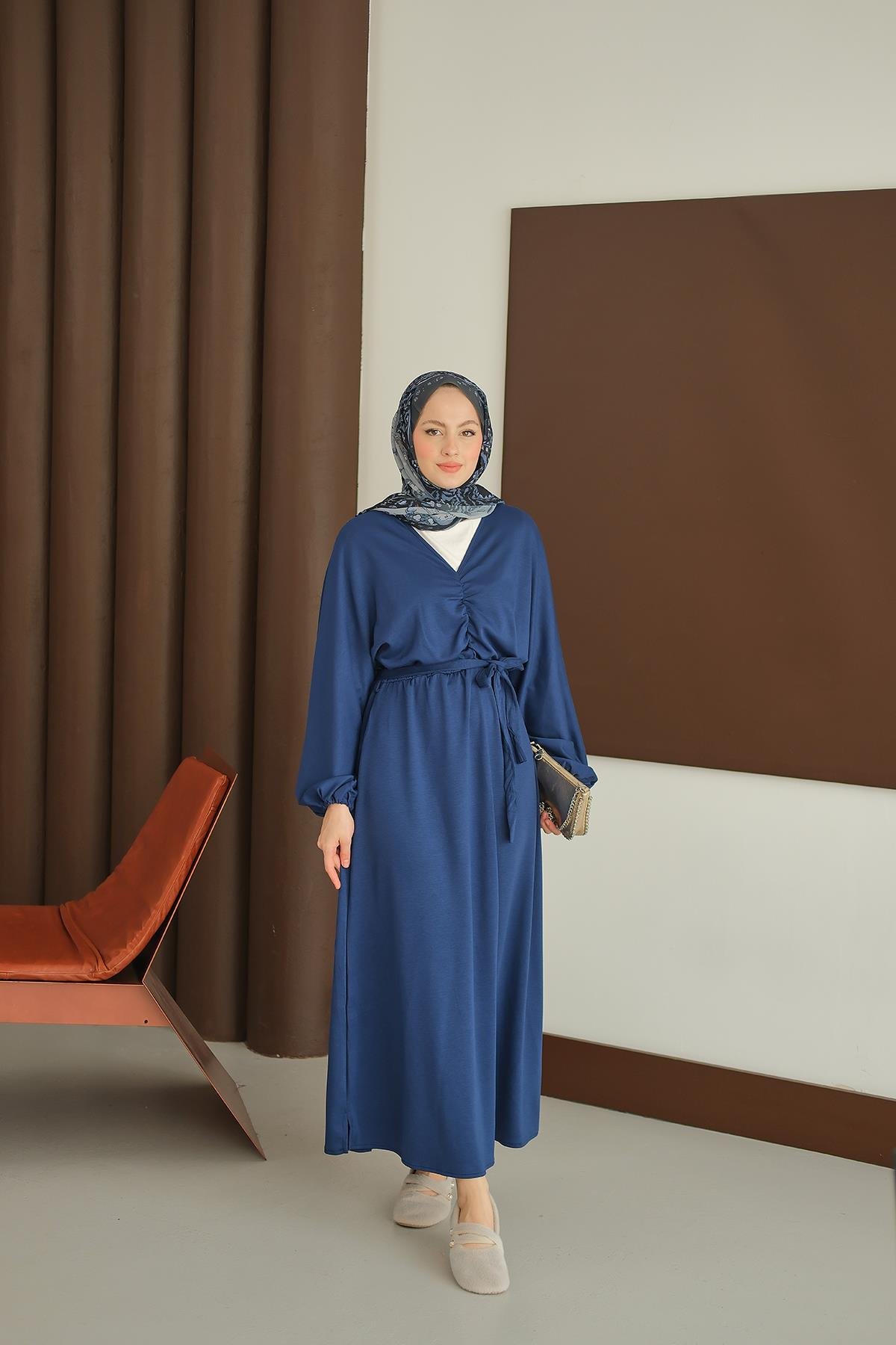Büzgü Detay Elbise Saks Mavi