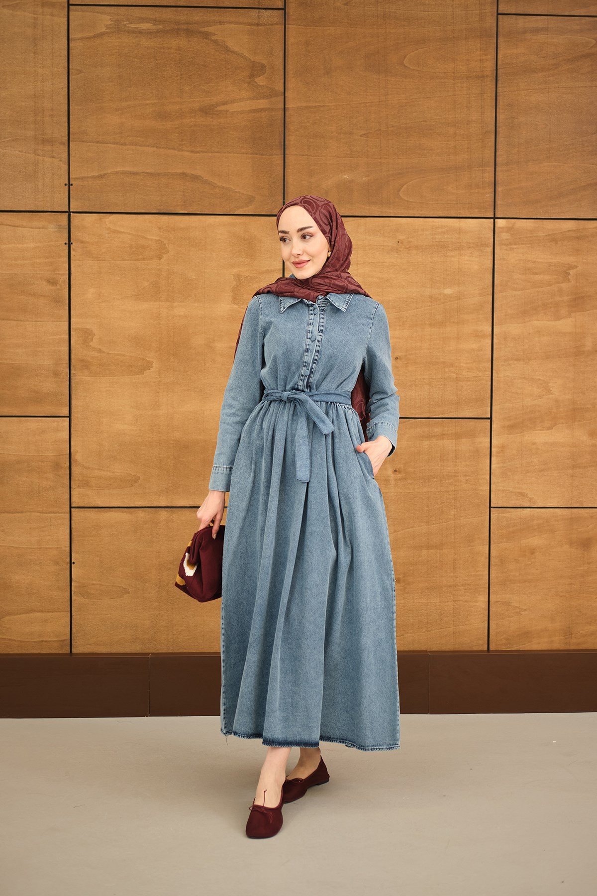 Büzgü Detay Yarım Düğmeli Bel Bağlamalı Kot Elbise Buz Mavi