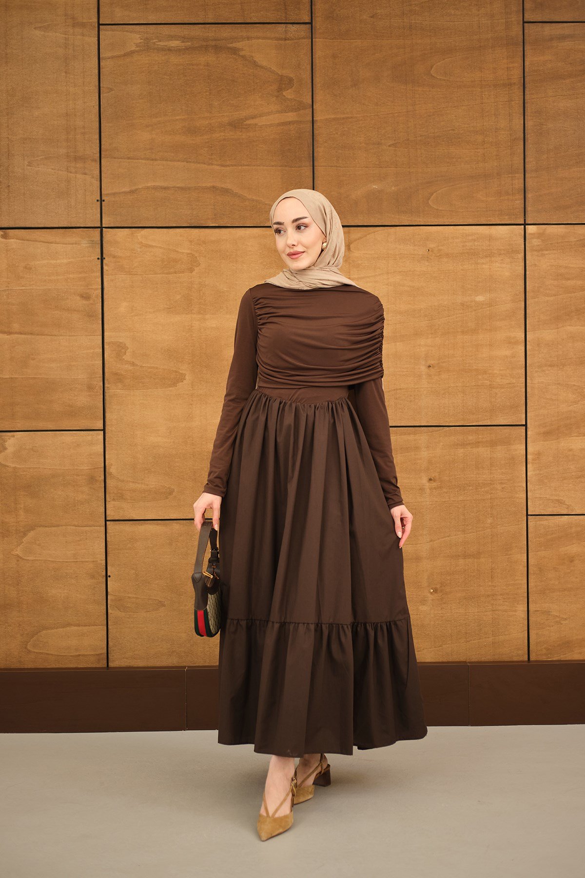 Büzgü Detaylı Sandy Poplin Elbise Kahverengi