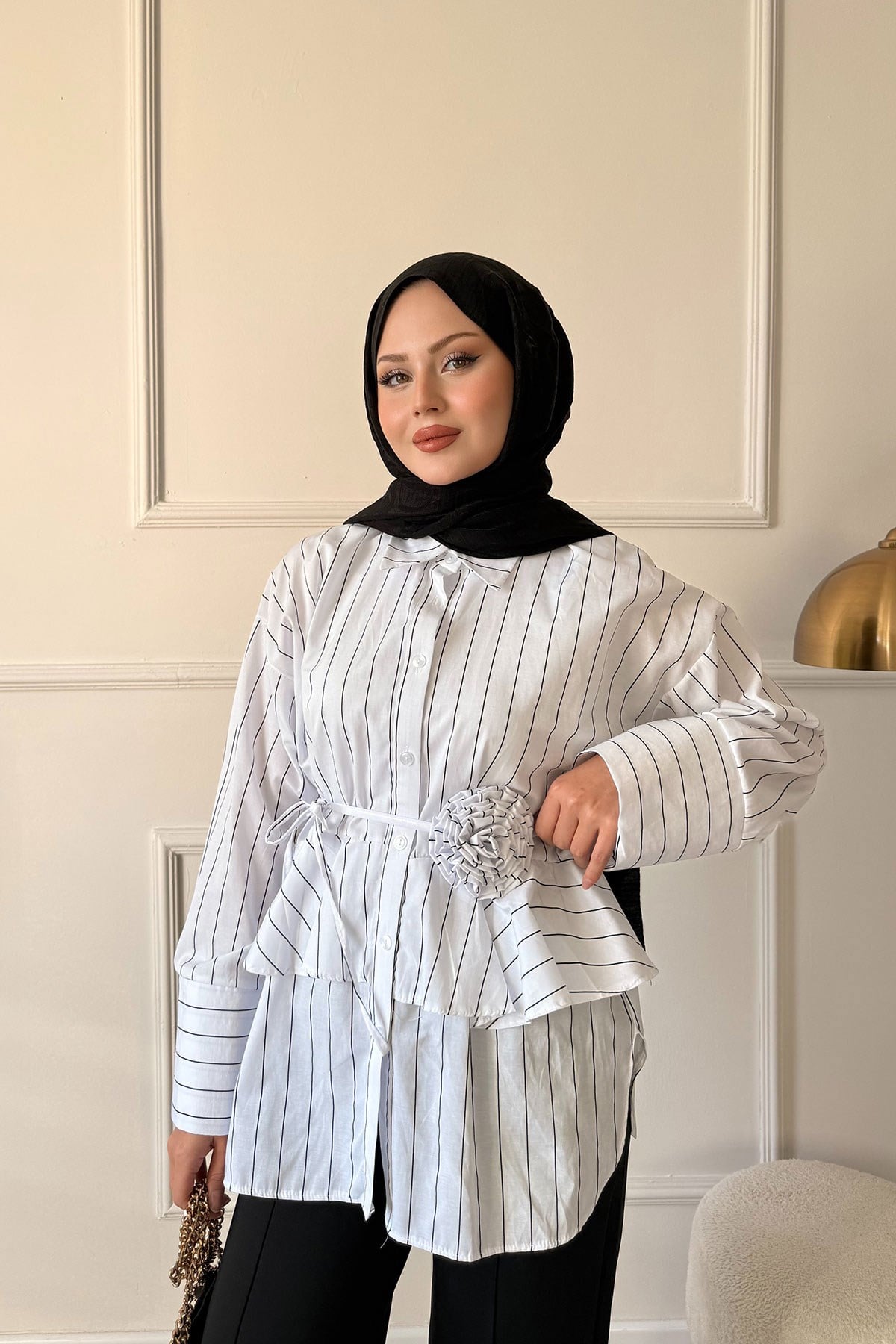 Büzgülü Bel Bağlamalı Çizgili Gömlek Beyaz