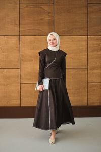 Çapraz Fermuar Detaylı Dikiş Detay Etekli Takım Kahverengi