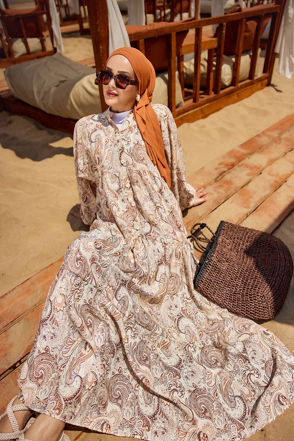 Cassime Desenli Elbise Açık Kahve