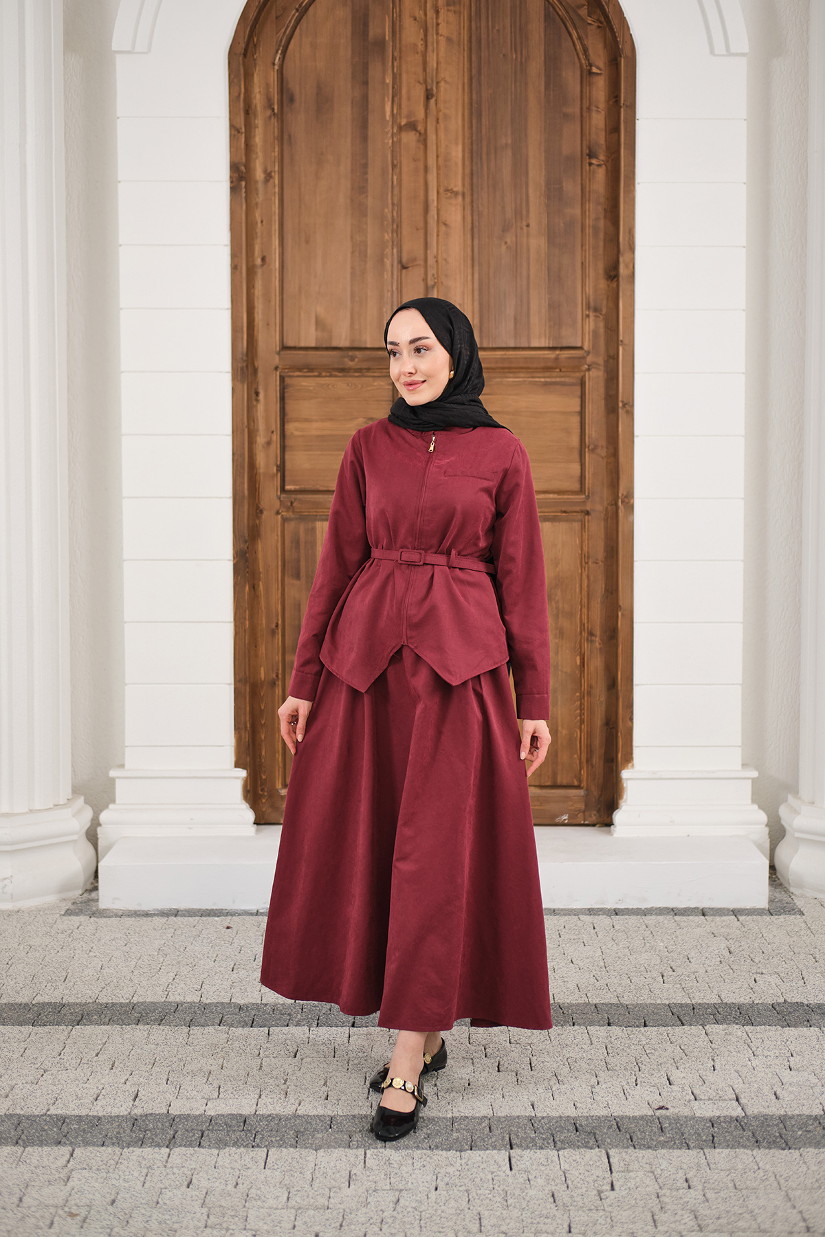 Cep Detay Fermuarlı Kemer Bağlamalı Etekli Takım Bordo