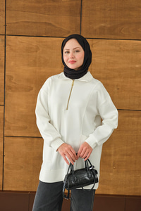 Cep Ve Yaka Detay Yarım Fermuarlı Sweat Beyaz