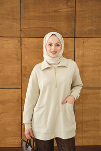 Cep Ve Yaka Detay Yarım Fermuarlı Sweat Krem