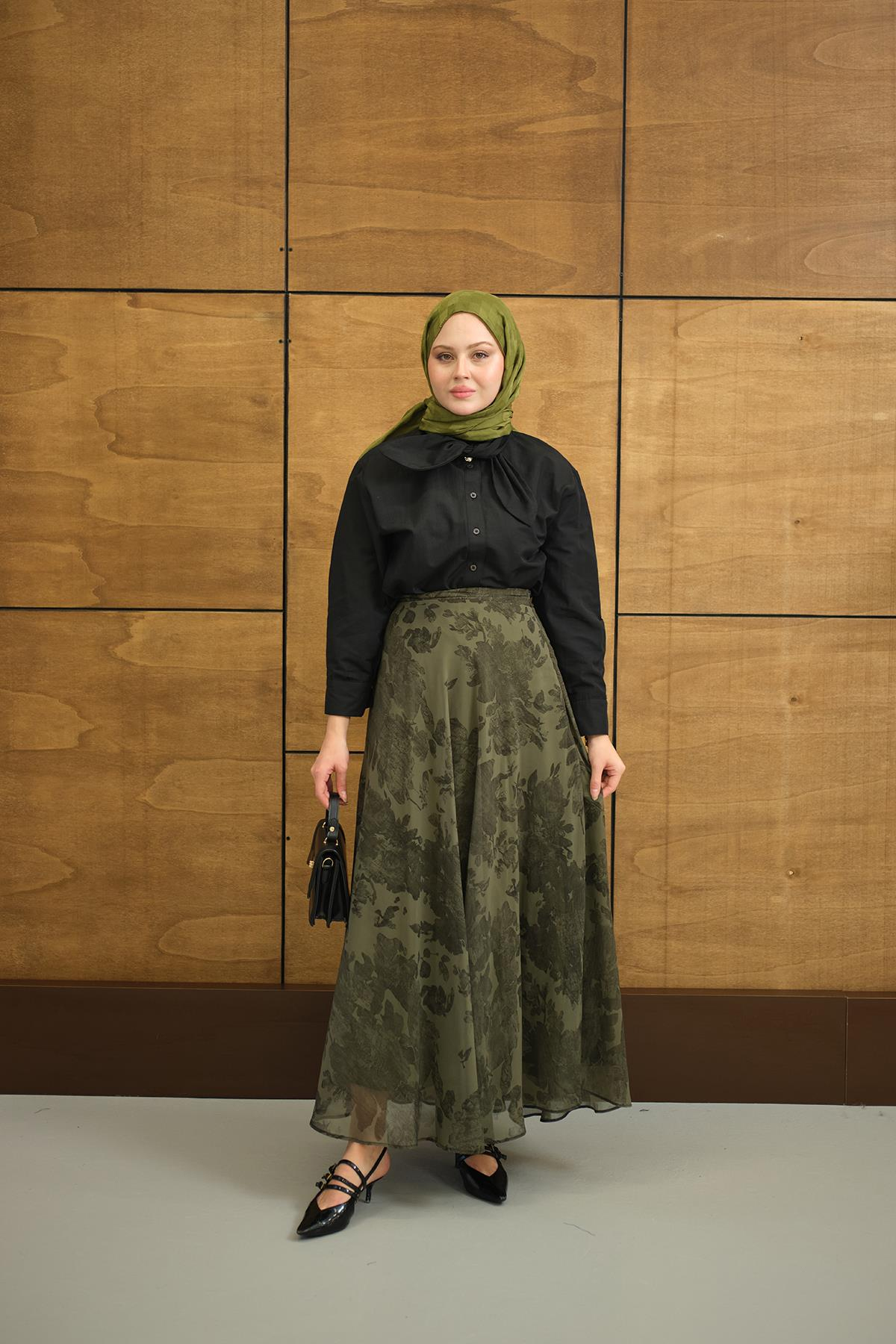 Çiçek Desen Astarlı Şifon Etek Yeşil