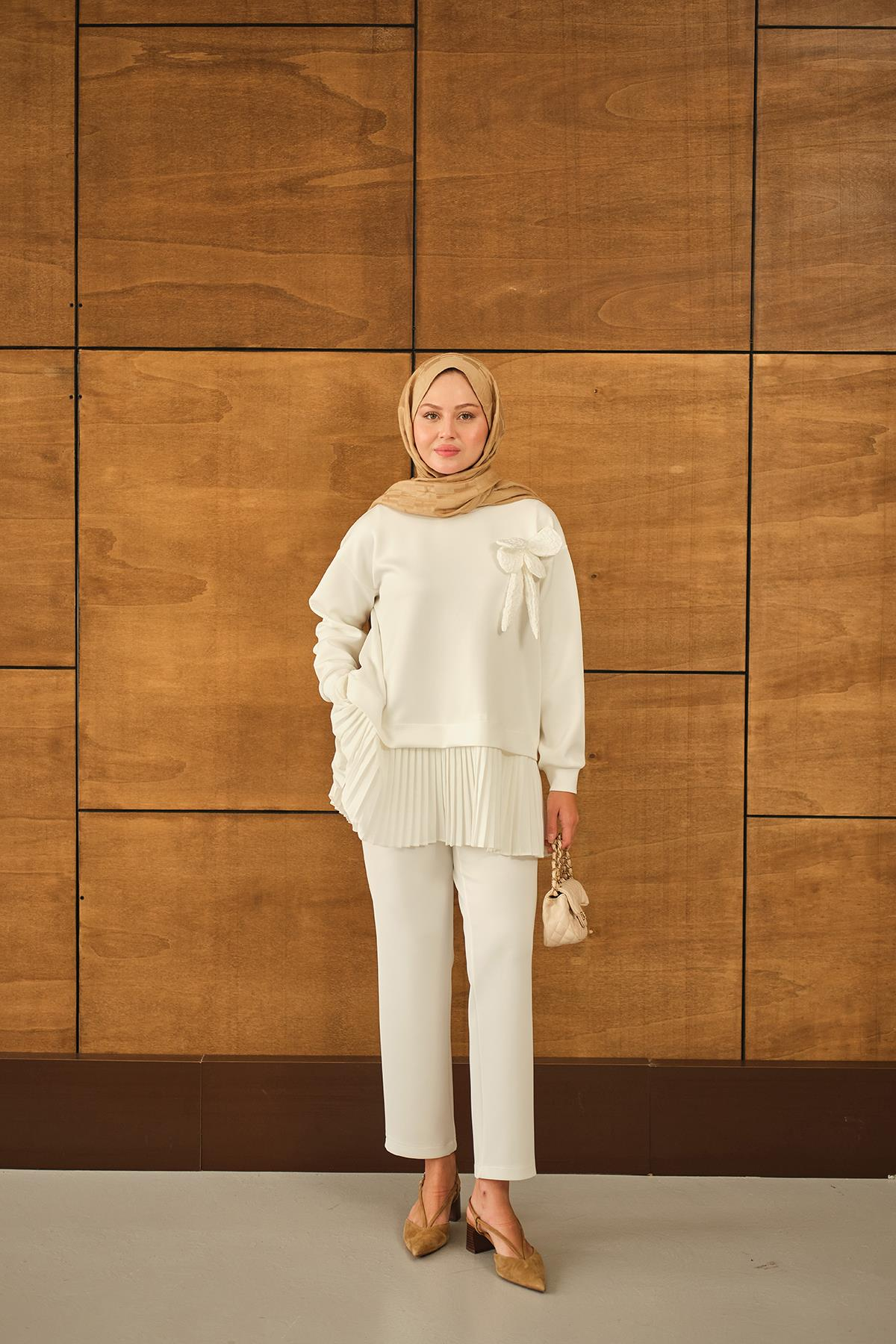 Çiçek Detay Piliseli Takım Beyaz