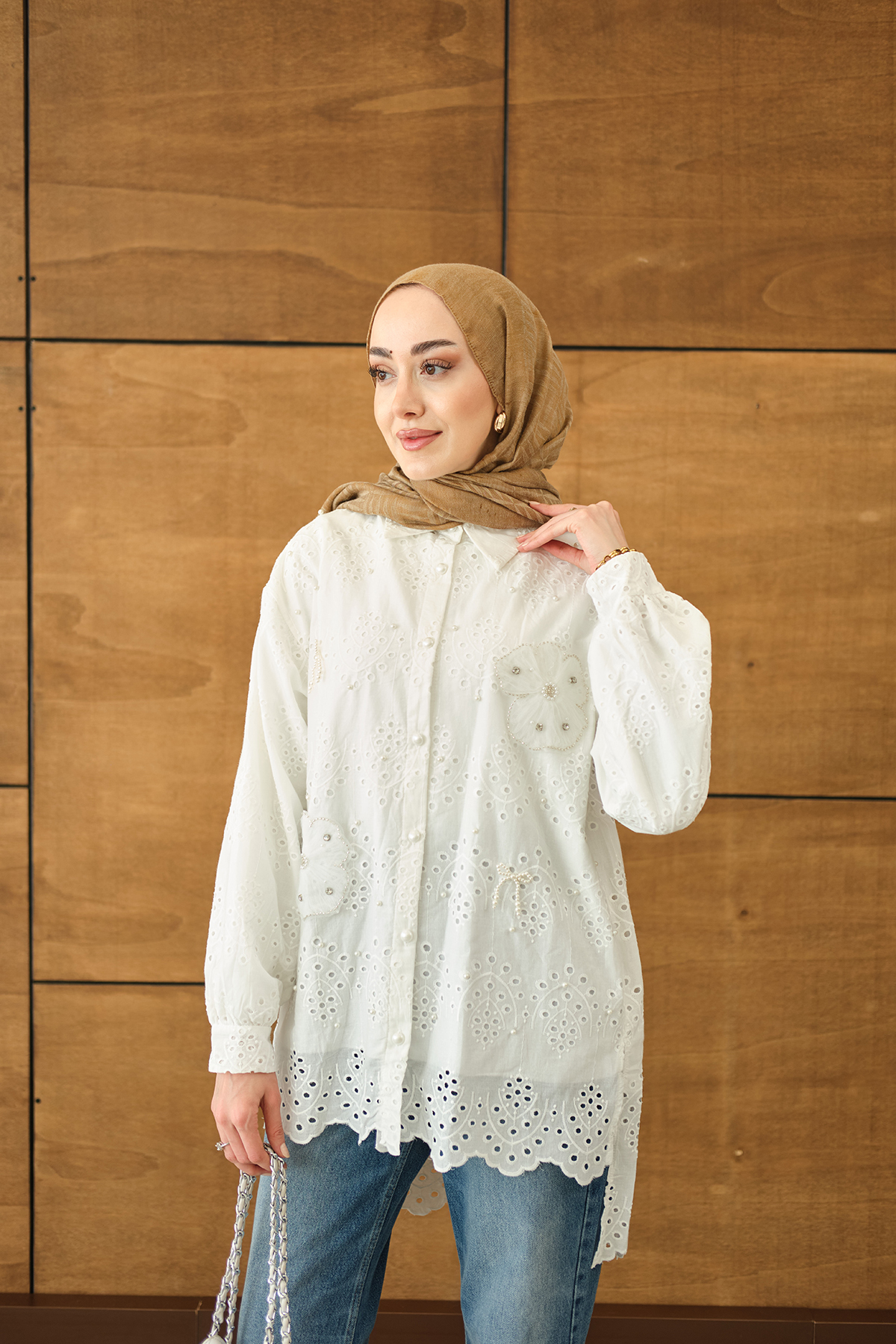 Çiçek Taş İşleme Detay Brode Ve İnci Detaylı Gömlek Beyaz