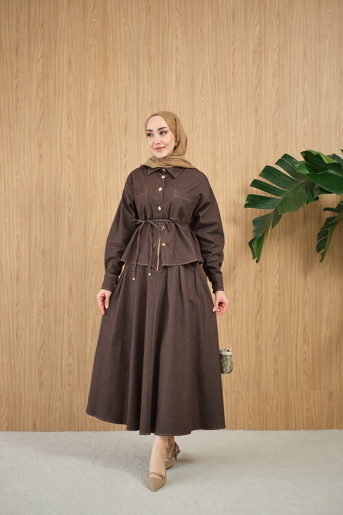 Çift Cep Detay Bel Bağlamalı Kot Takım Kahverengi