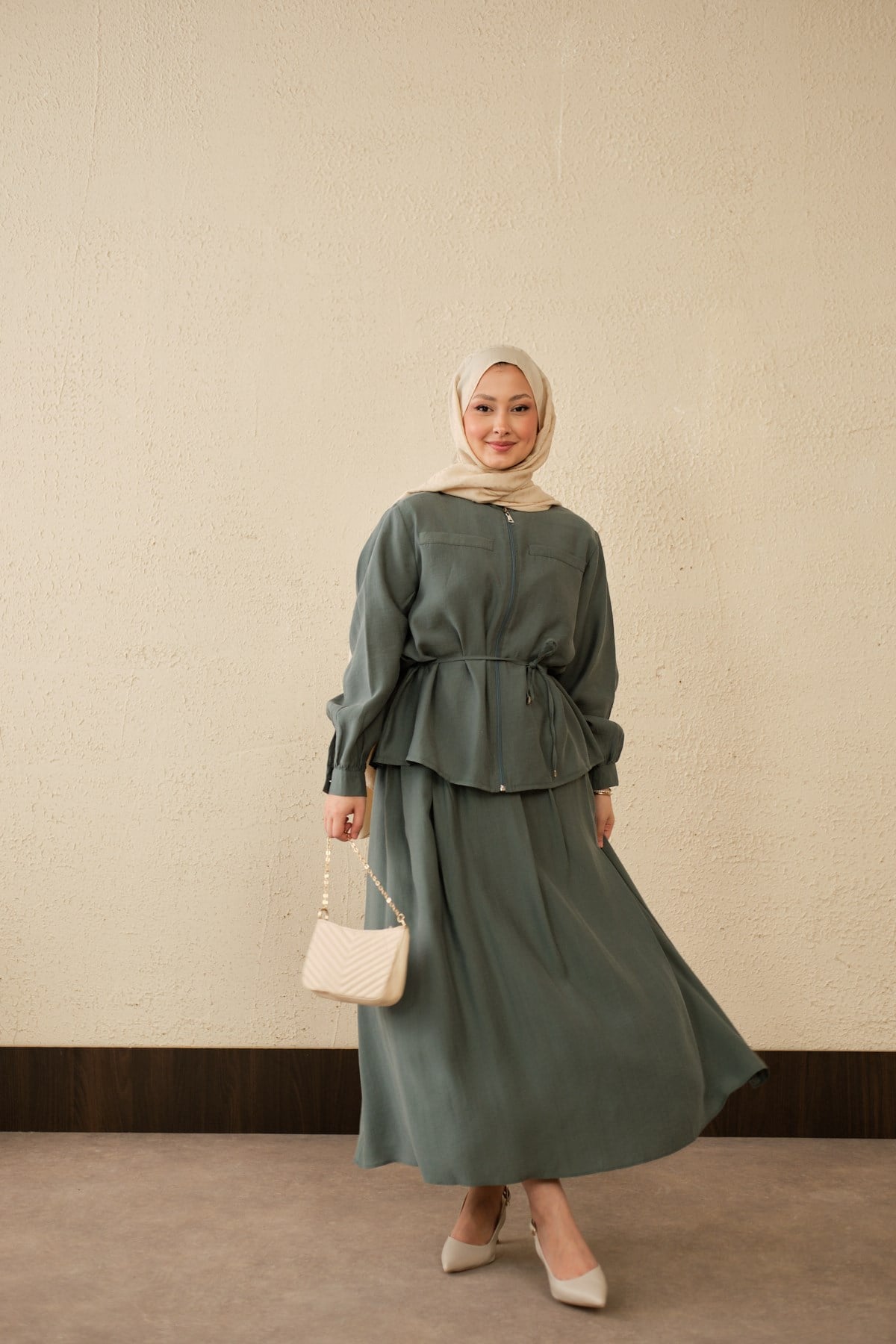 Çift Cep Görünümlü Bel Bağlamalı Etekli Takım Yeşil