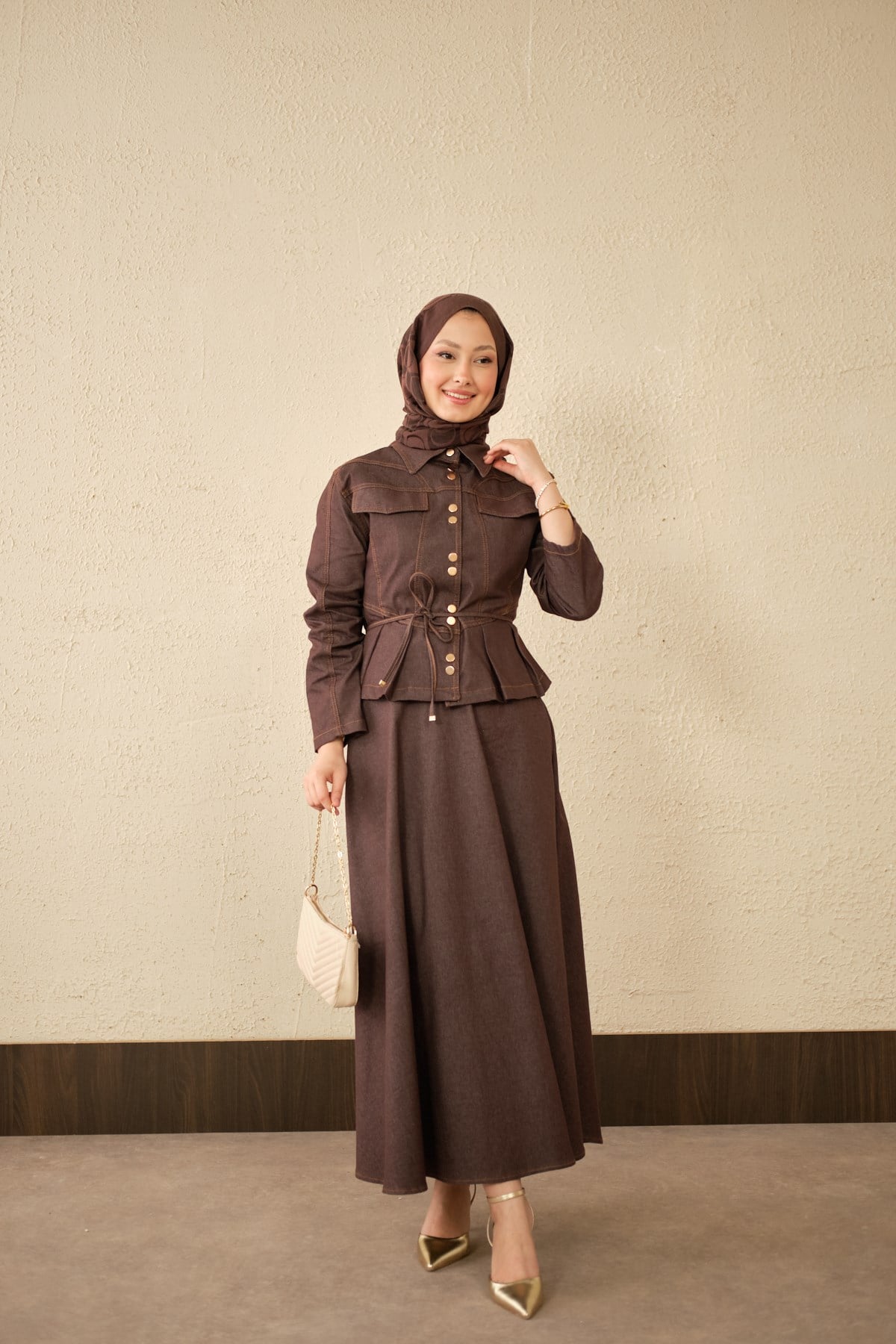 Çift Cep Görünümlü Dikiş Detay Kot Takım Kahverengi
