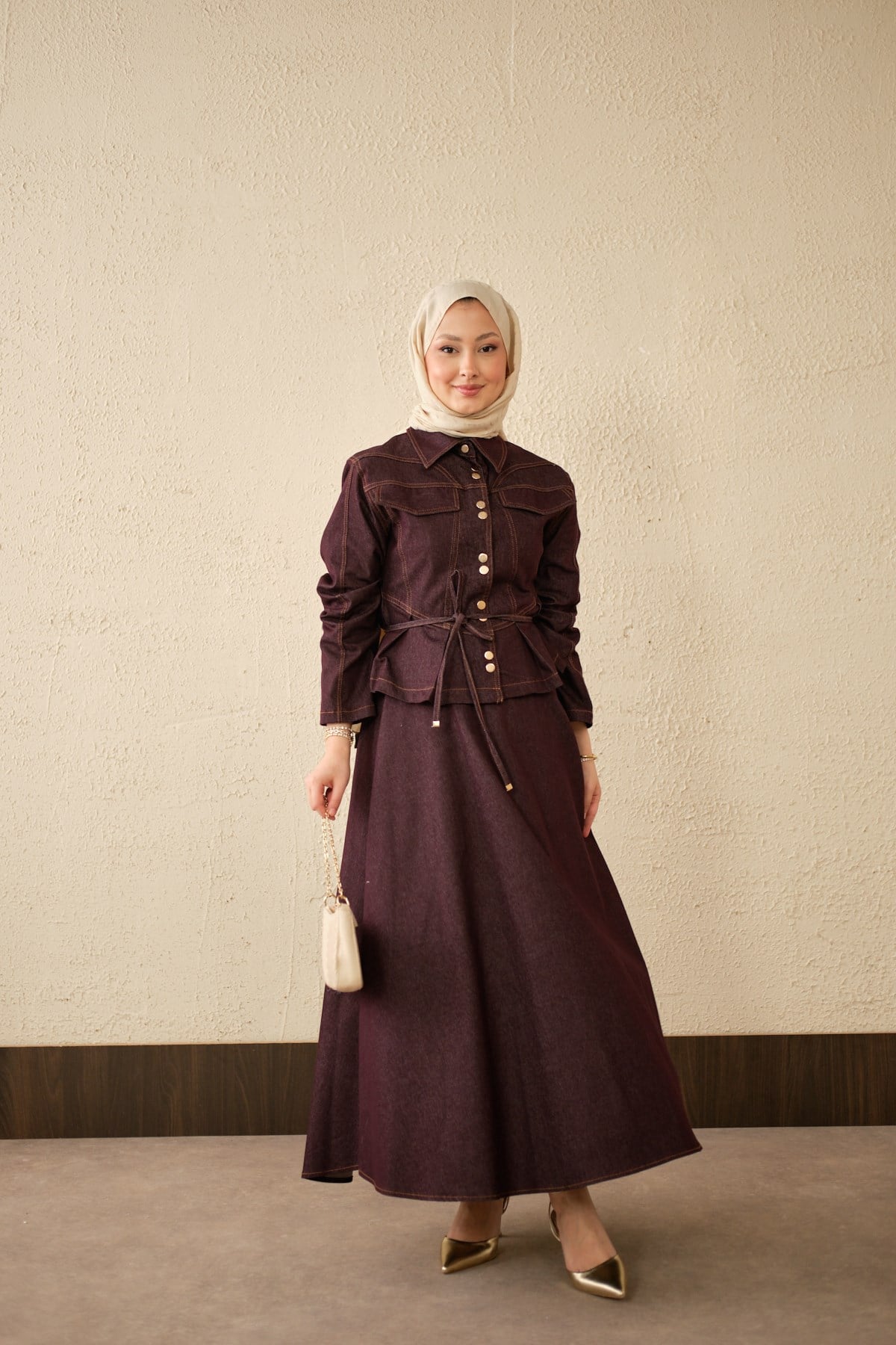 Çift Cep Görünümlü Dikiş Detay Kot Takım Mürdüm