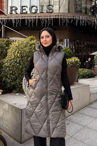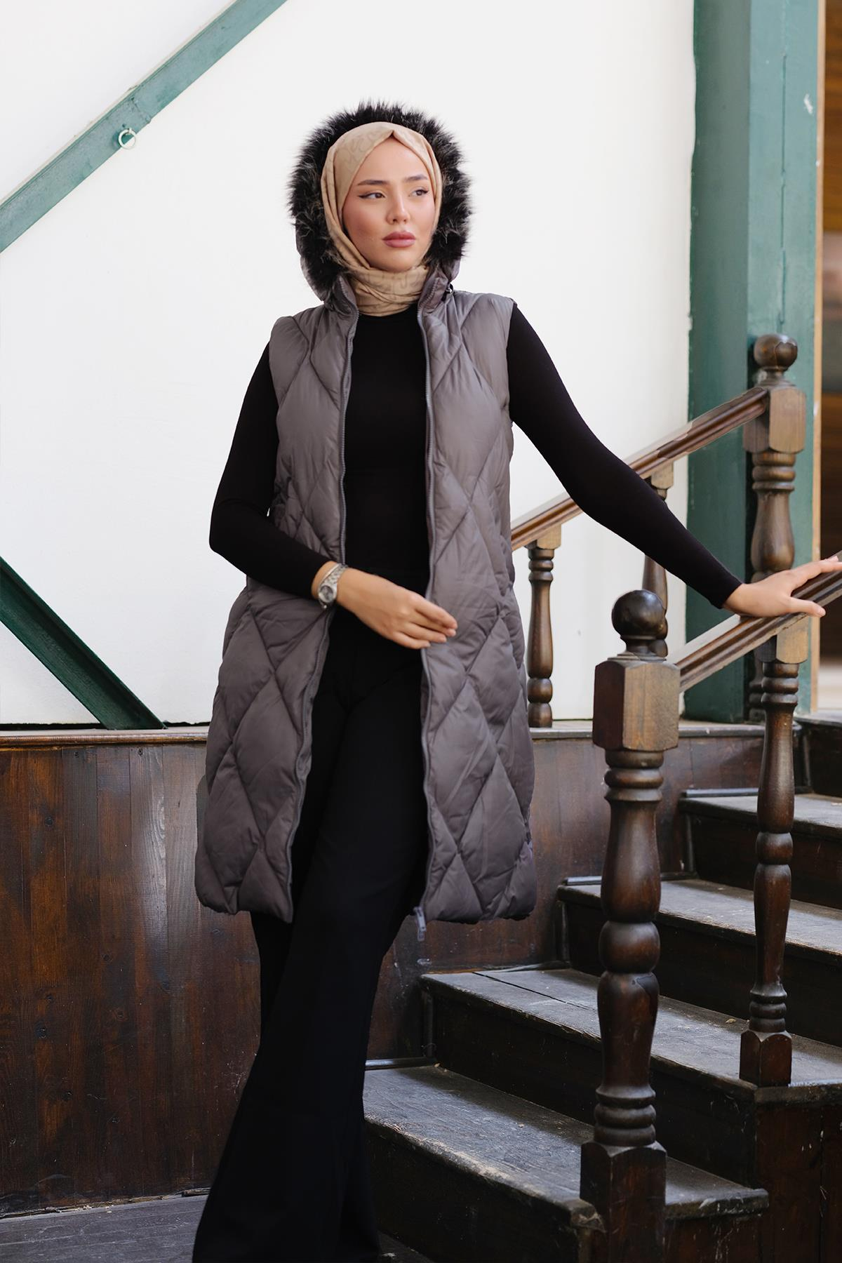 Çift Cepli Kapüşonlu Yelek Gri