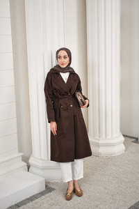 Çift Cepli Omuz Apolet Detay Bel Bağlamalı Kot Trenç Kahverengi