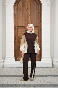 Çift Garni Detaylı Takım Kahverengi