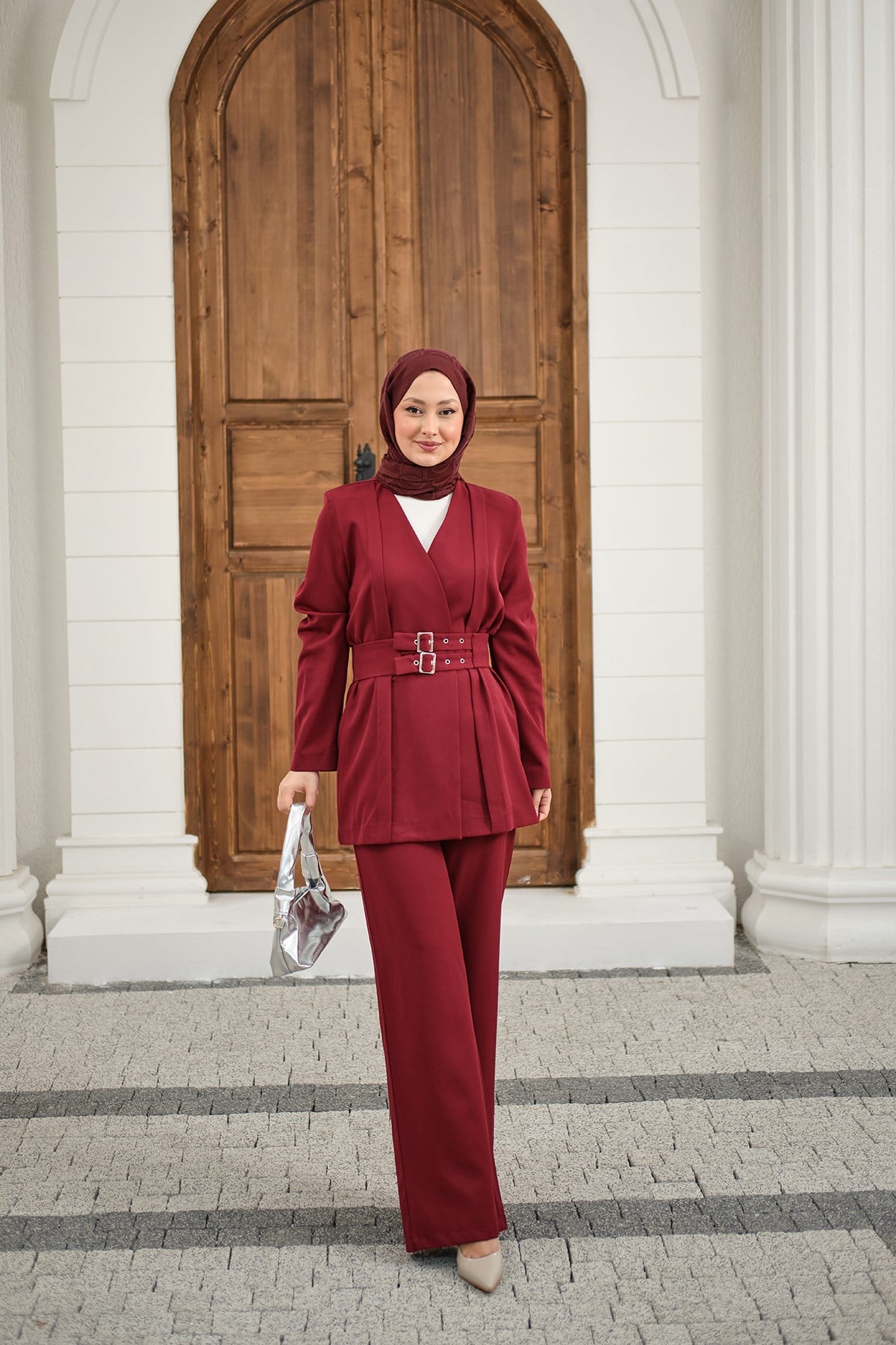 Çift Kemerli Ceketli Takım Kırmızı