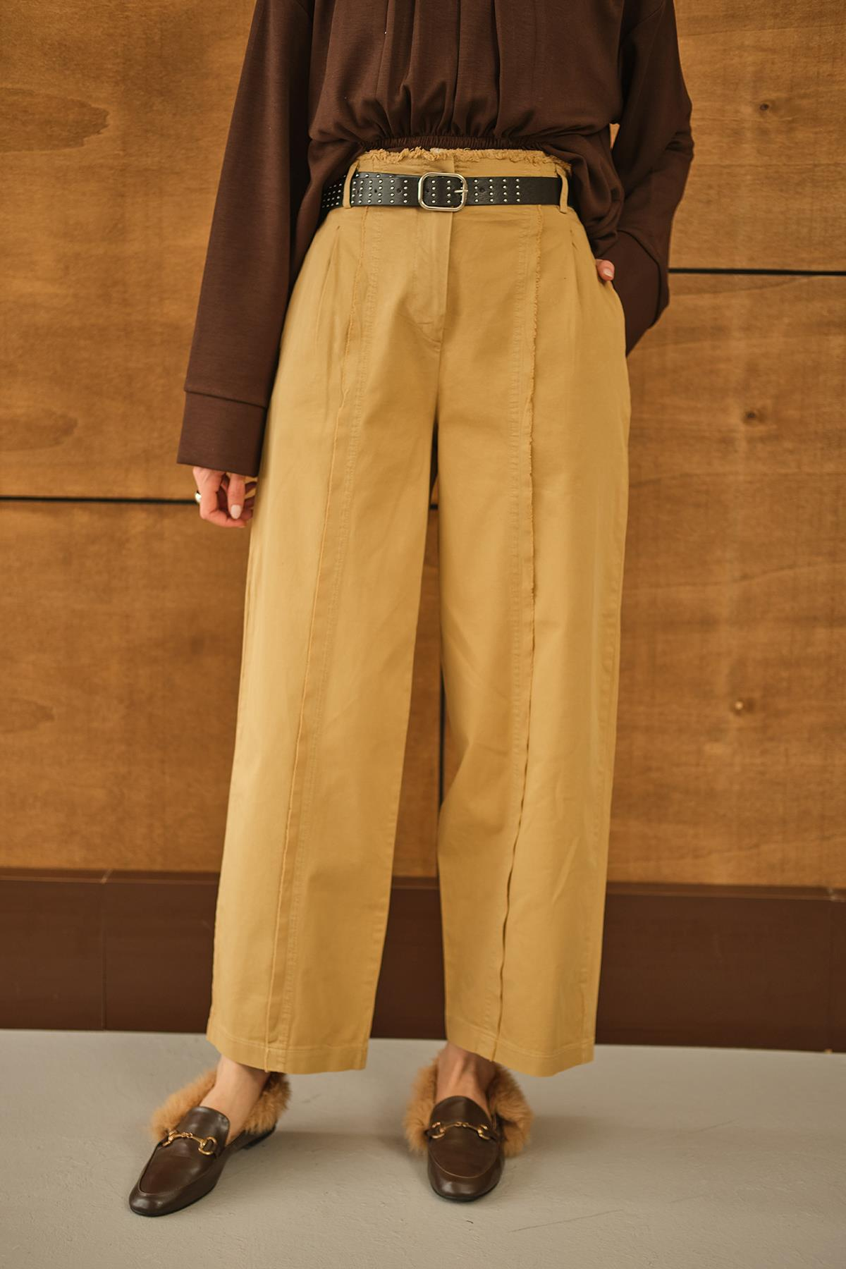 Çima Detaylı Kemerli Pantolon Hardal