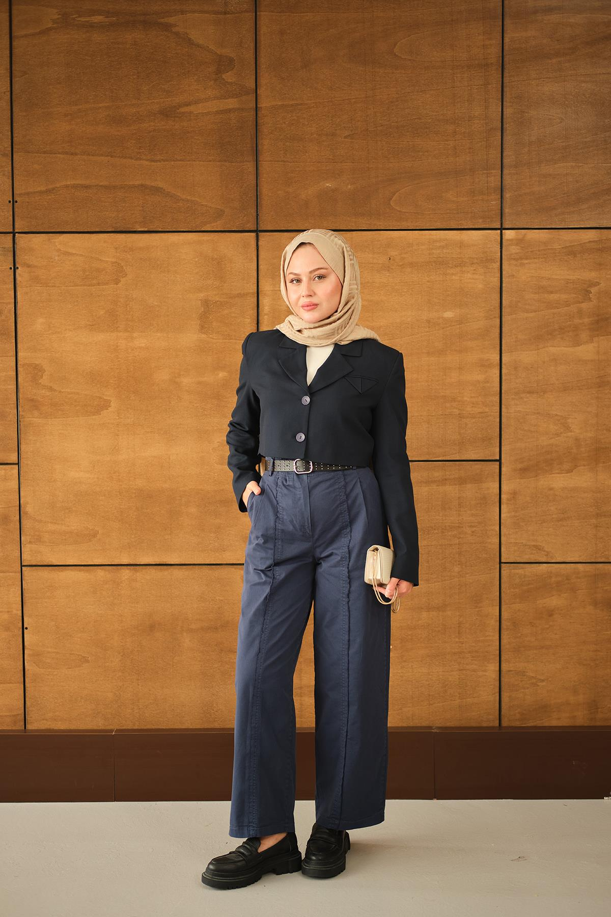 Çima Detaylı Kemerli Pantolon Lacivert