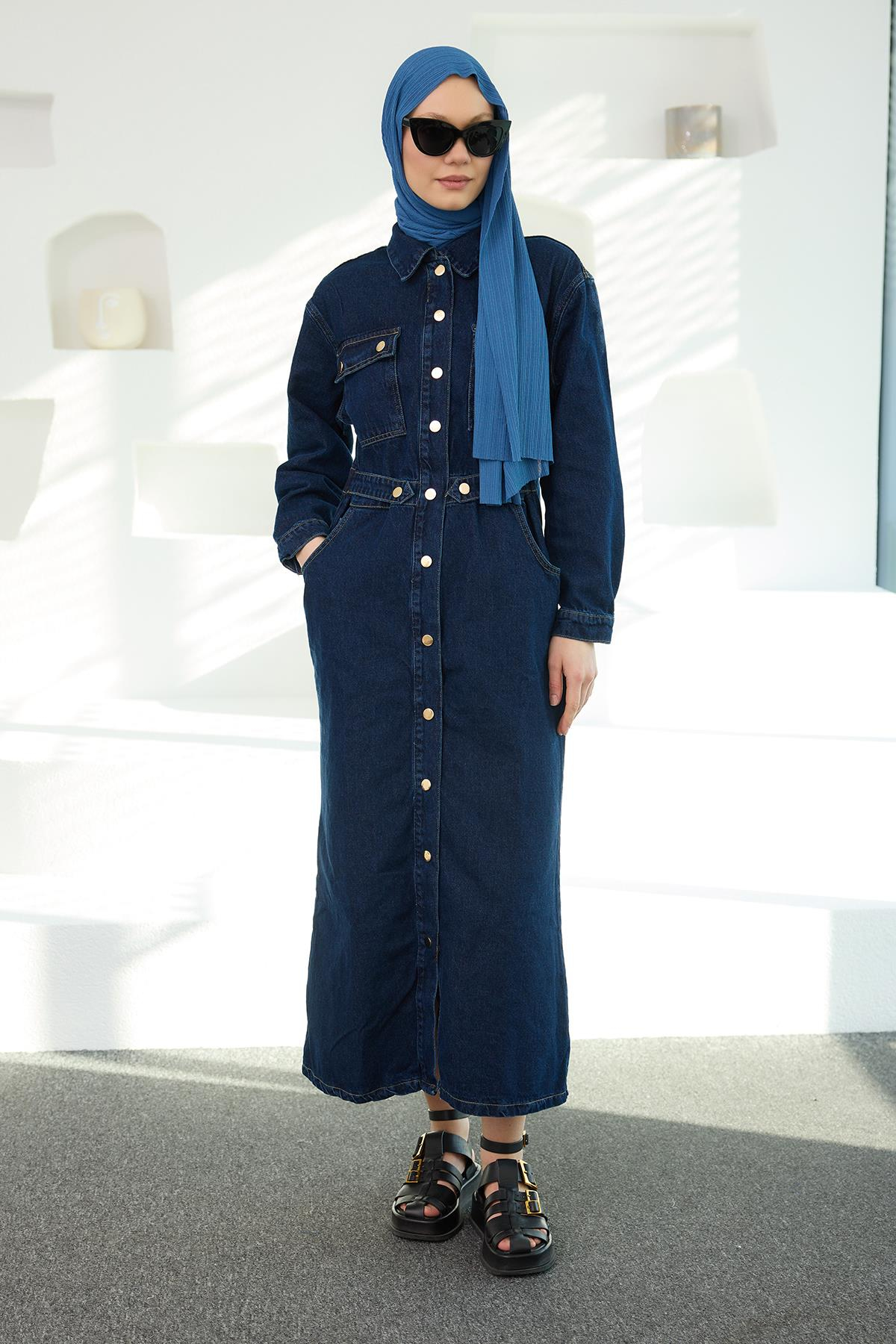 Çıt Çıt Kemerli Kot Elbise Koyu Mavi