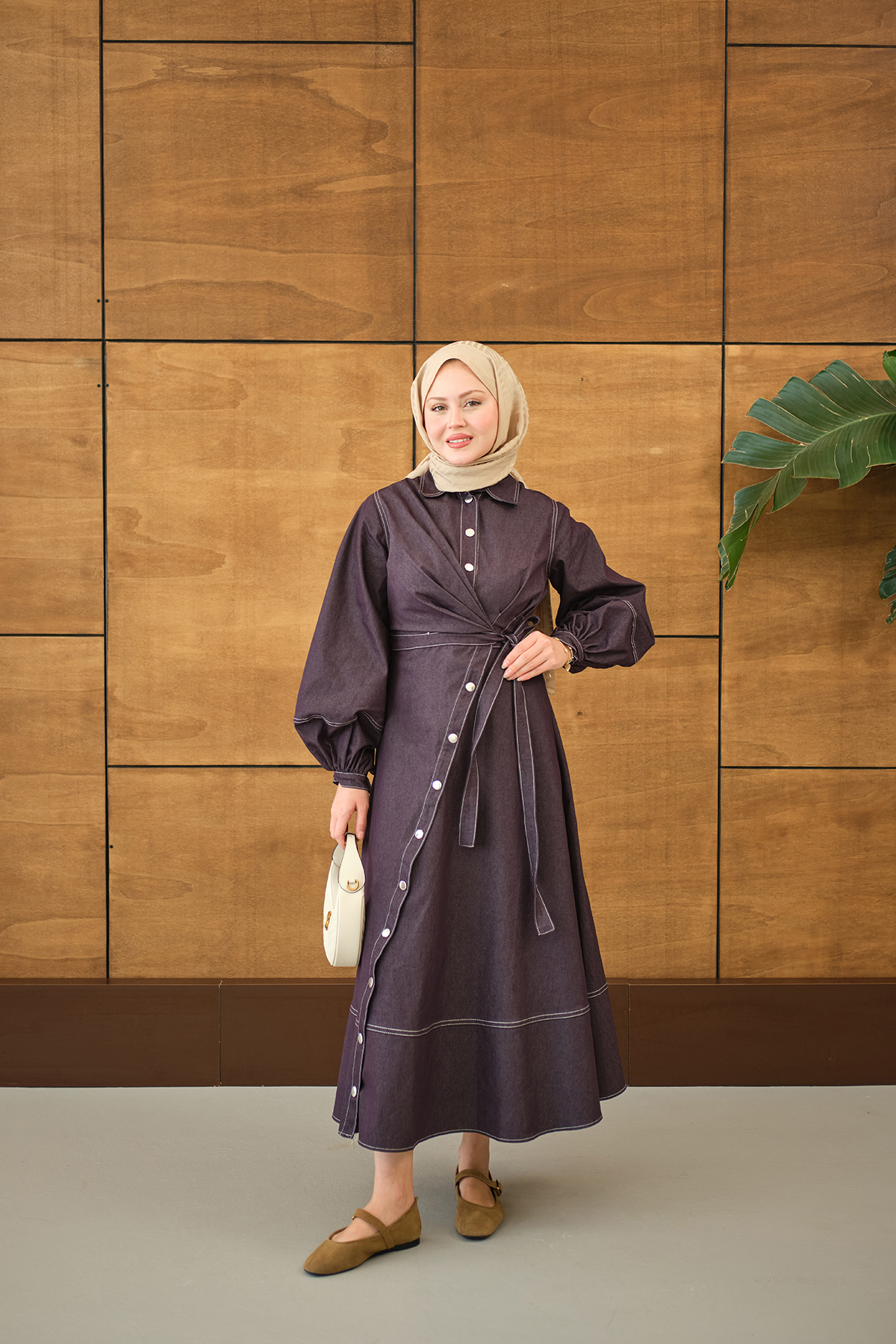 Çıtçıtlı Dikiş İz Detay Yandan Bağlamalı Kot Elbise Mürdüm