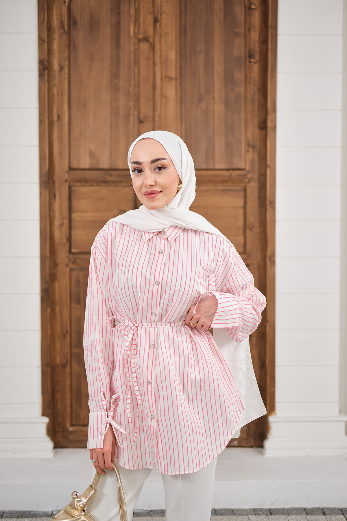 Çizgi Desenli Sim Detay Gömlek Pembe