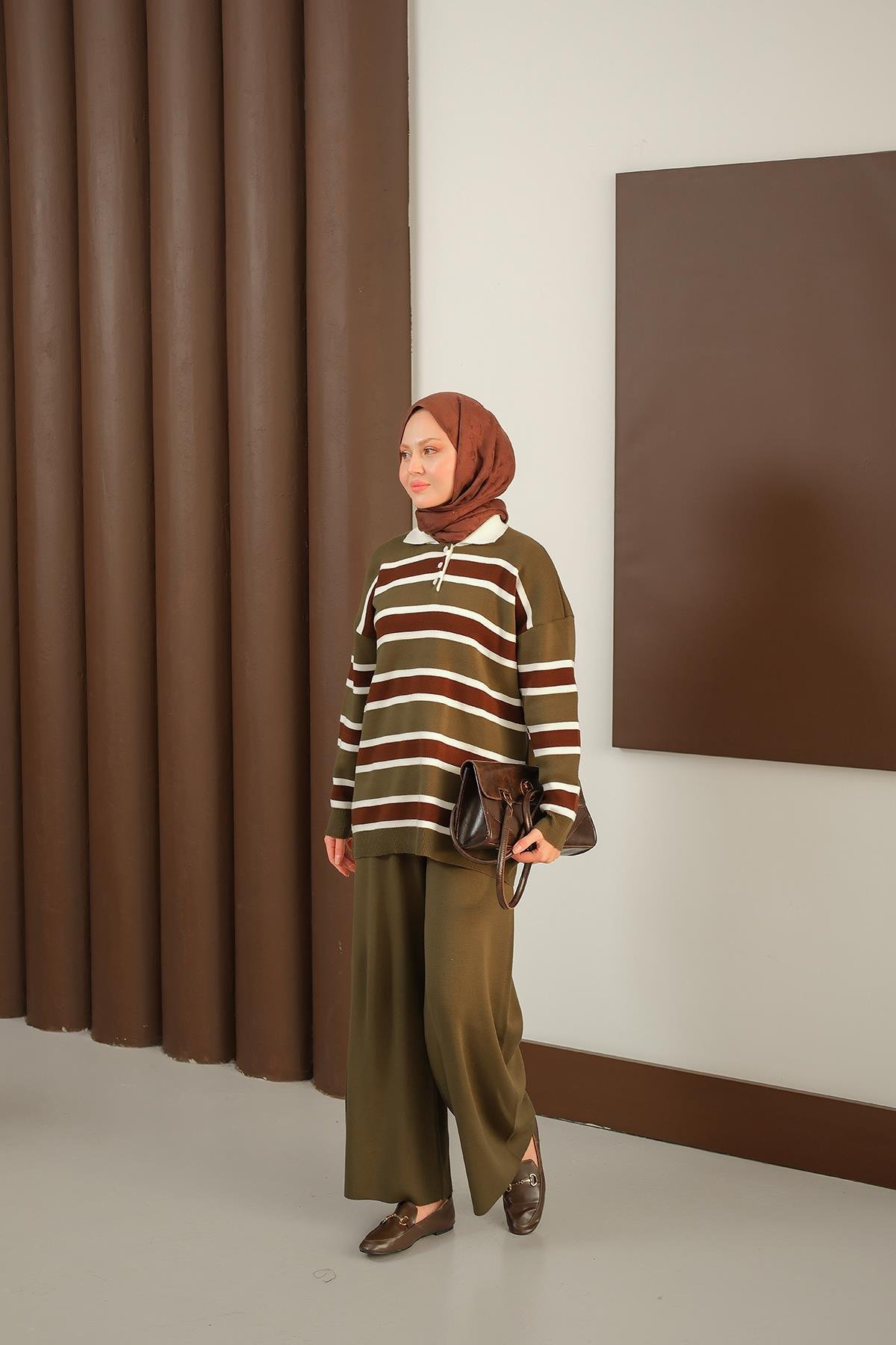 Çizgi Düğme Detay Takım Haki Yeşil