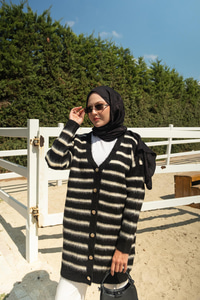 Çizgili Uzun Triko Hırka Siyah
