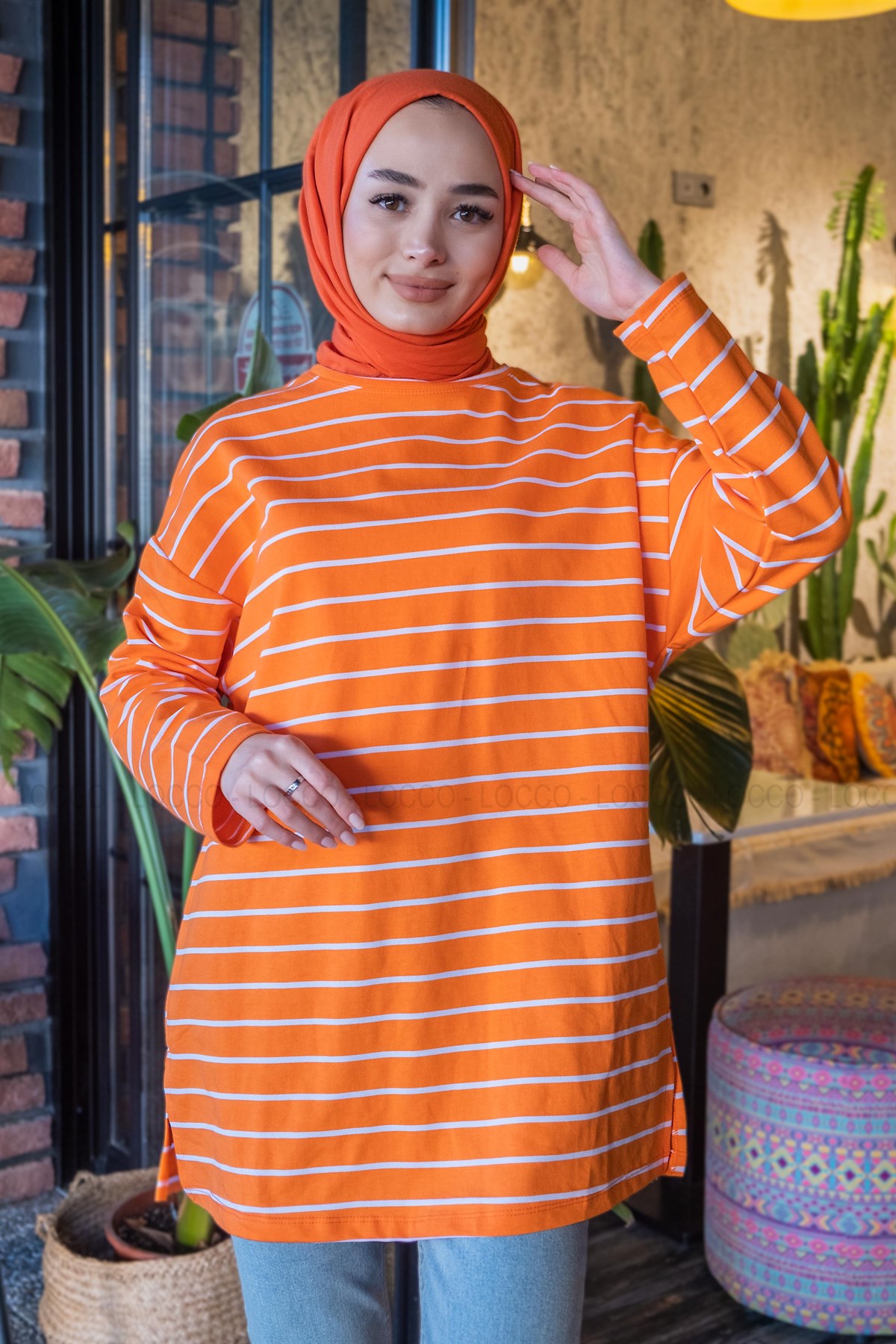Uygun Fiyatlı CIZGILI YAN YIRTMACLI TUNIK TURUNCU | Loccomoda.com