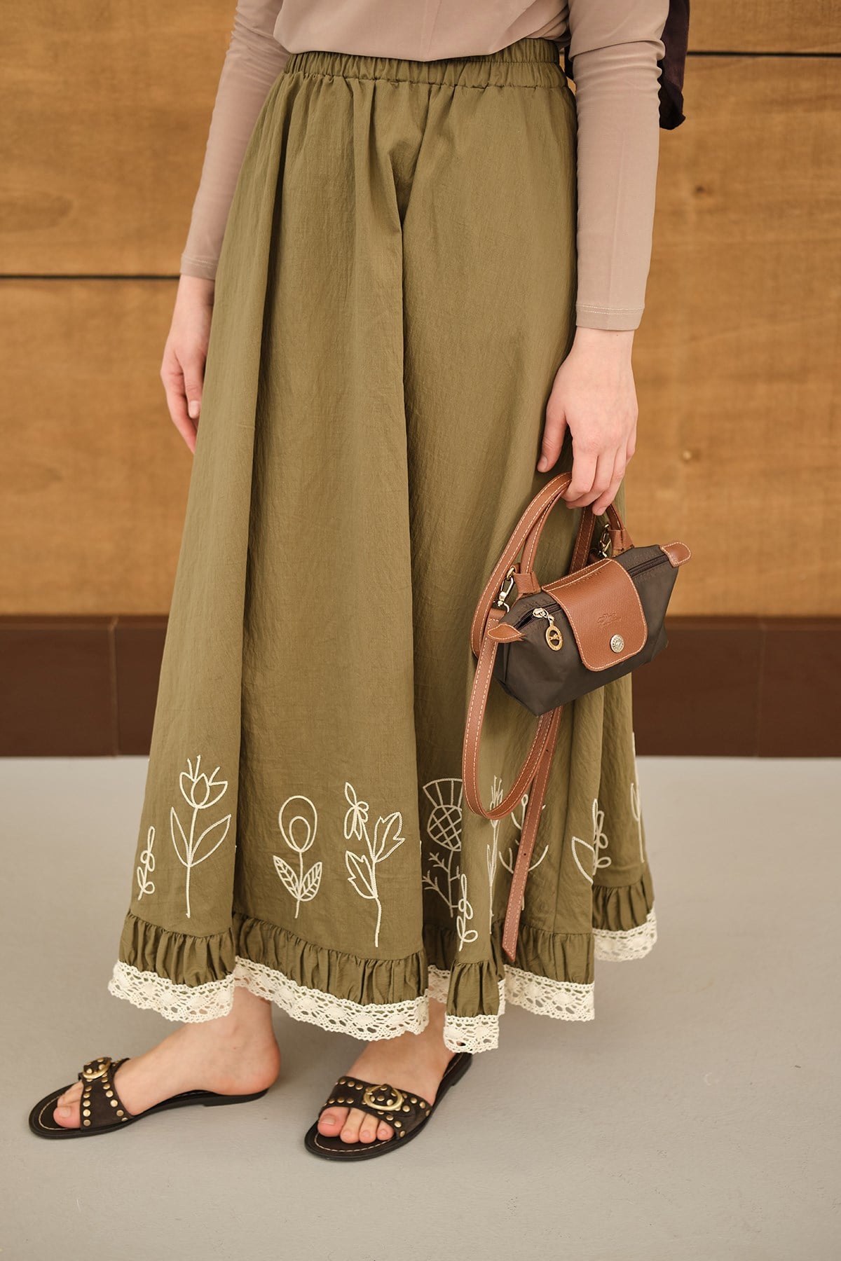Dantel Ve Çiçek Nakışlı Etek Küf Yeşil