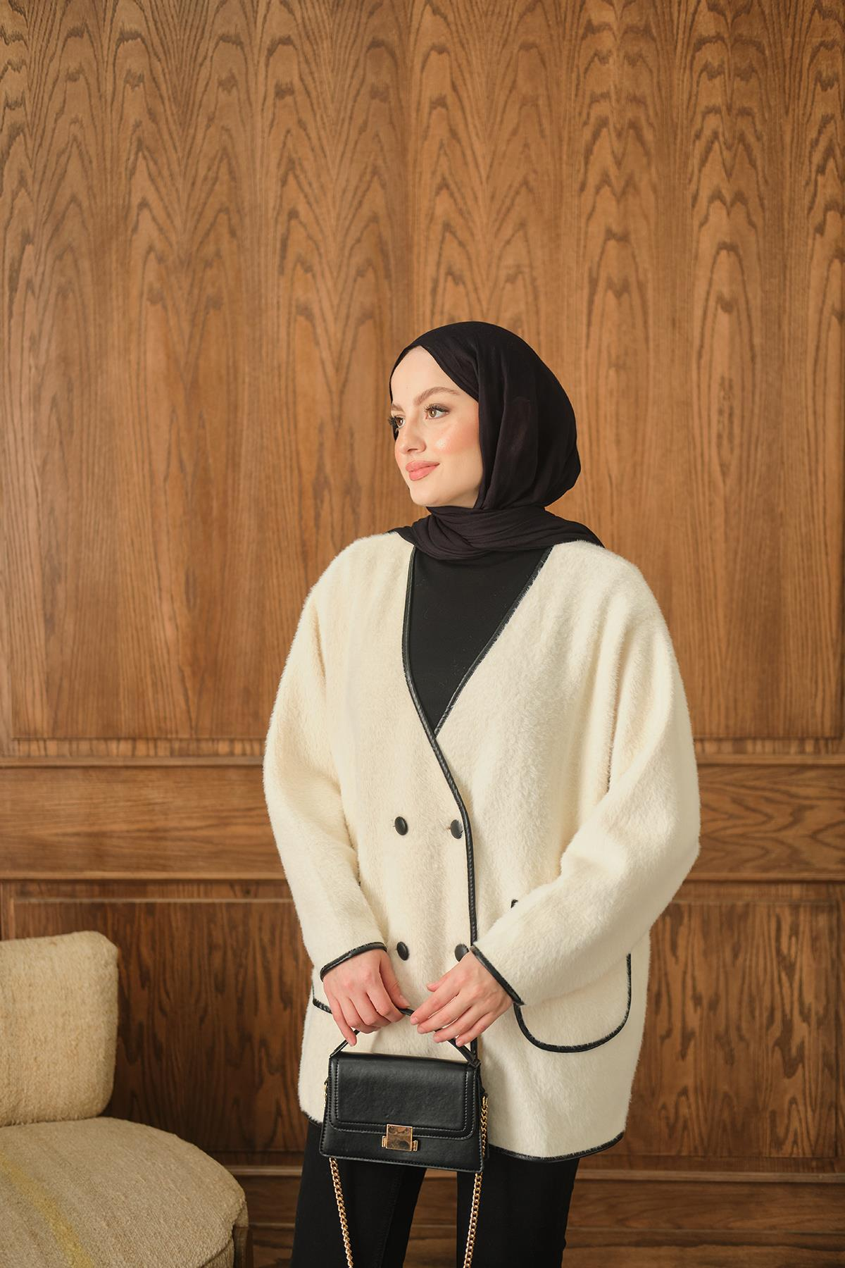 Deri Detay Peluş Hırka Krem