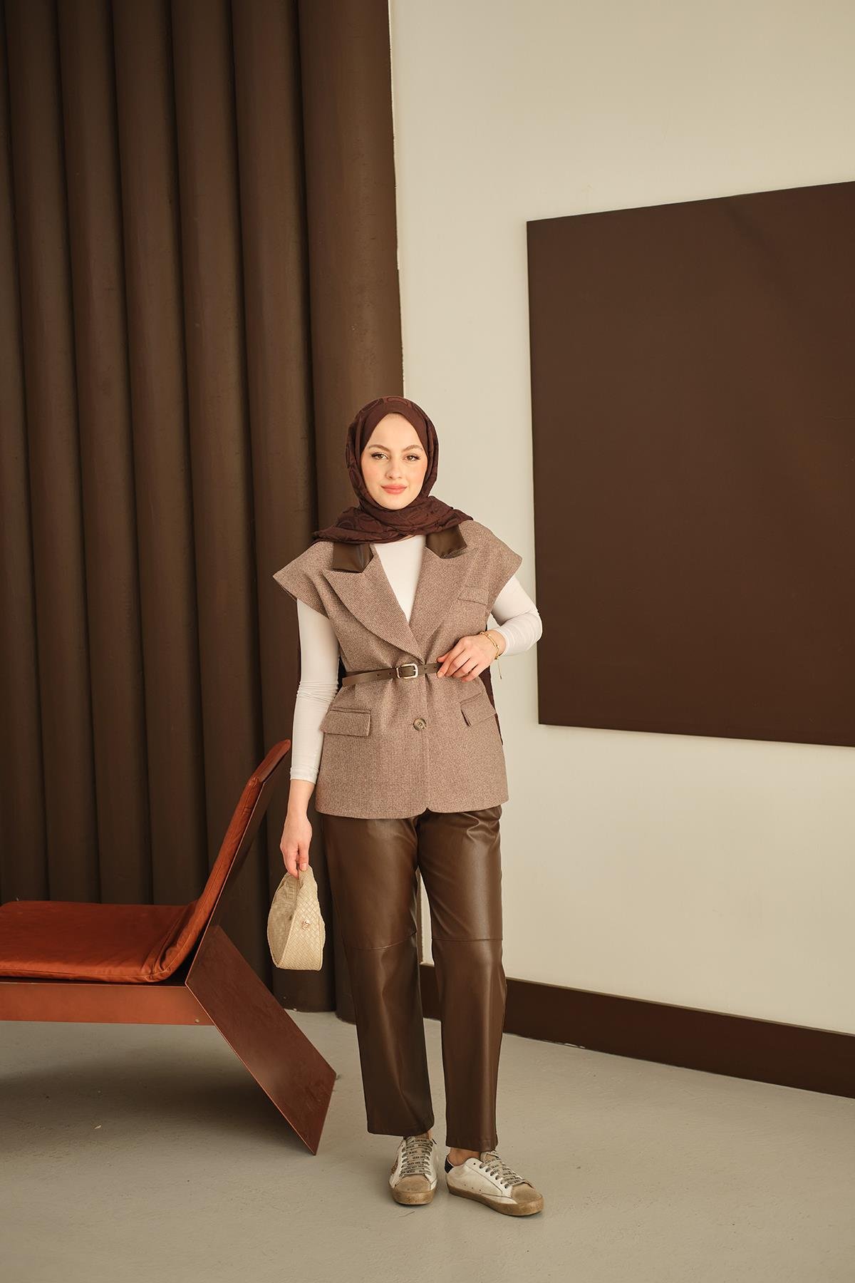 Deri Pantolonlu Yelekli Takım Kahverengi