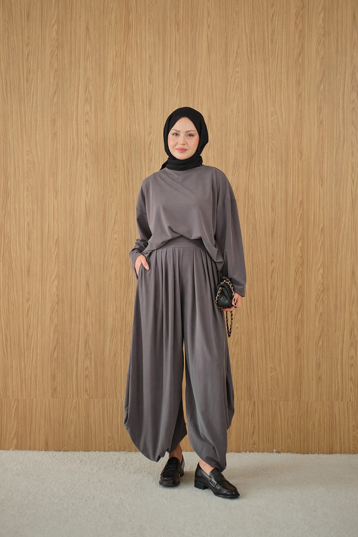 Dik Yaka Parça Detay Pantolonu Pile Detay Takım Gri