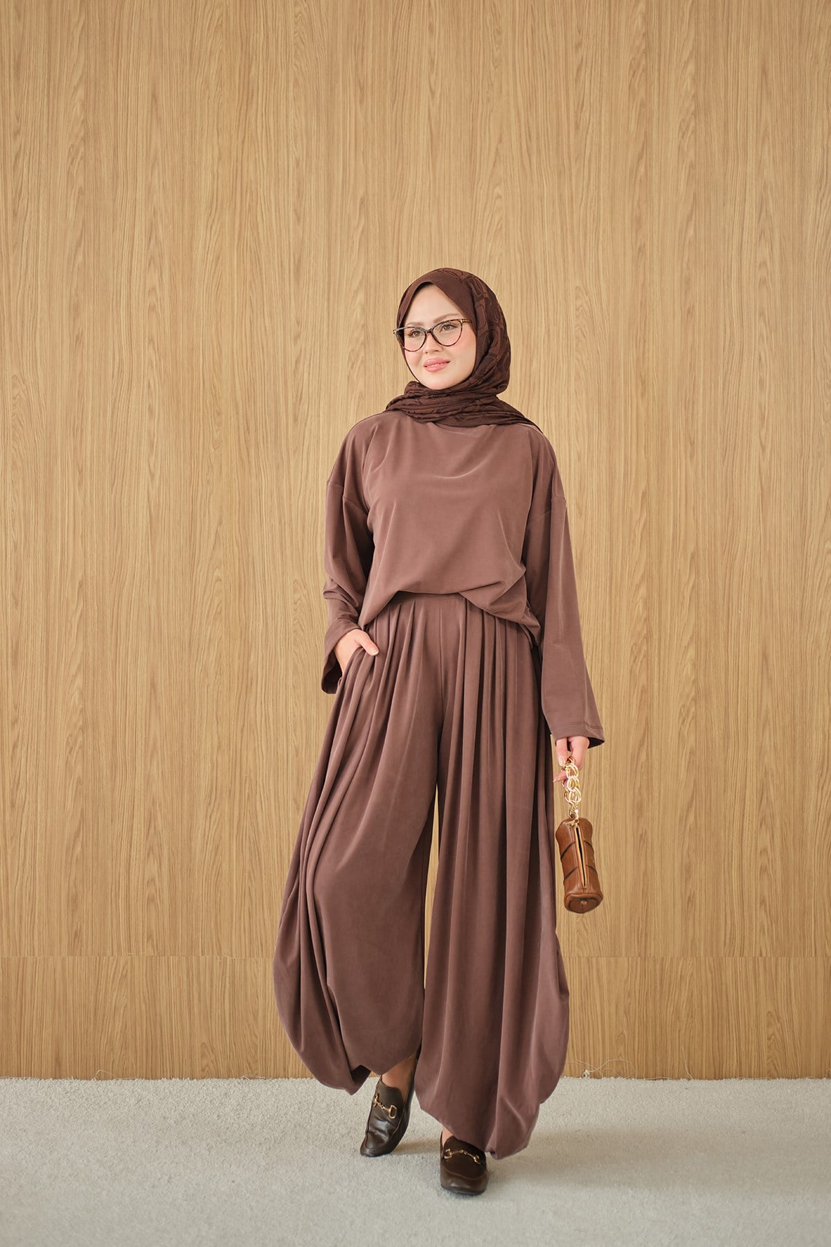 Dik Yaka Parça Detay Pantolonu Pile Detay Takım Kahverengi