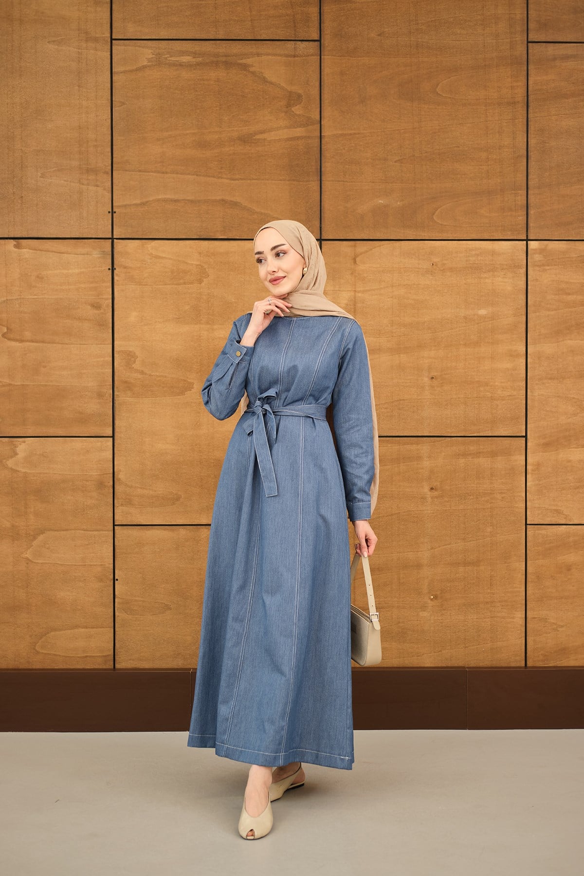 Dikiş Detay Bel Bağlamalı İnce Kot Elbise Buz Mavi