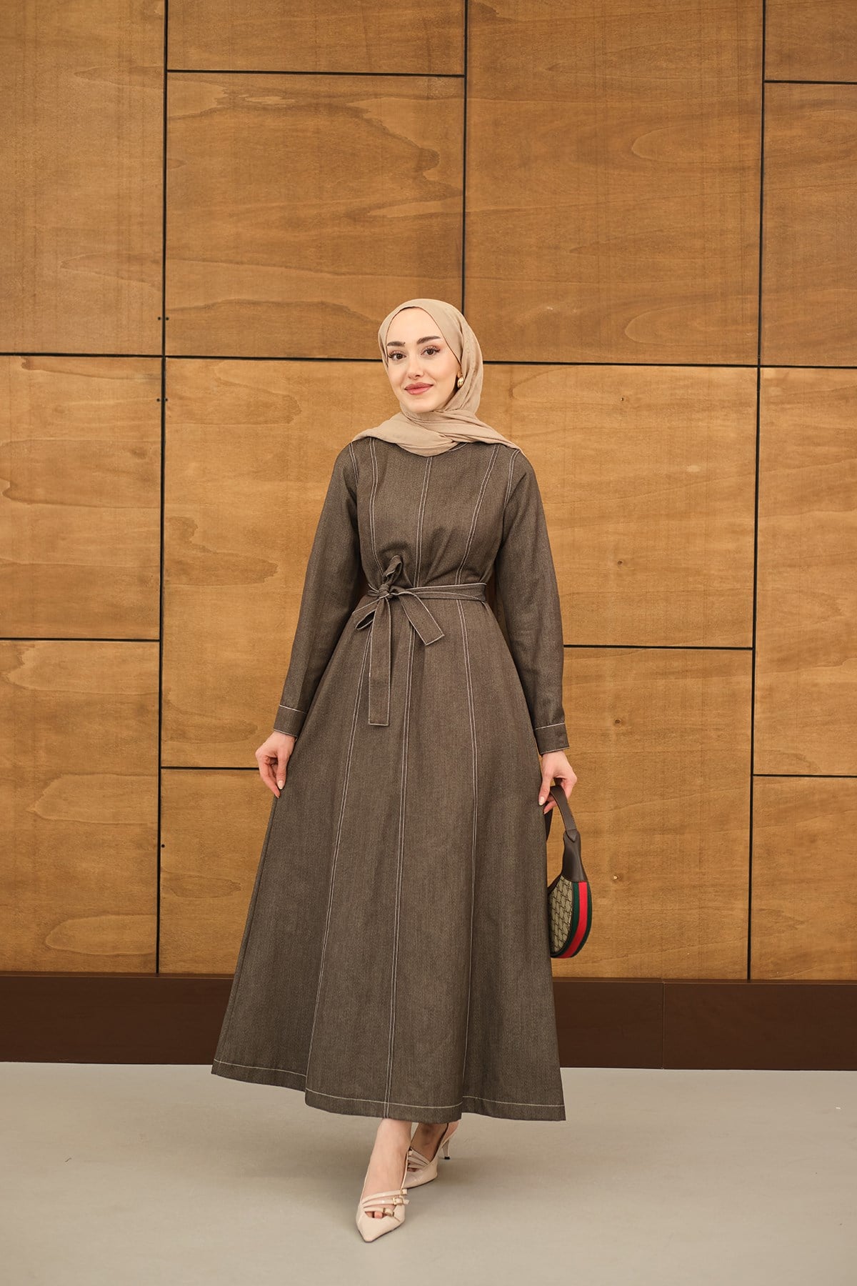 Dikiş Detay Bel Bağlamalı İnce Kot Elbise Kahverengi