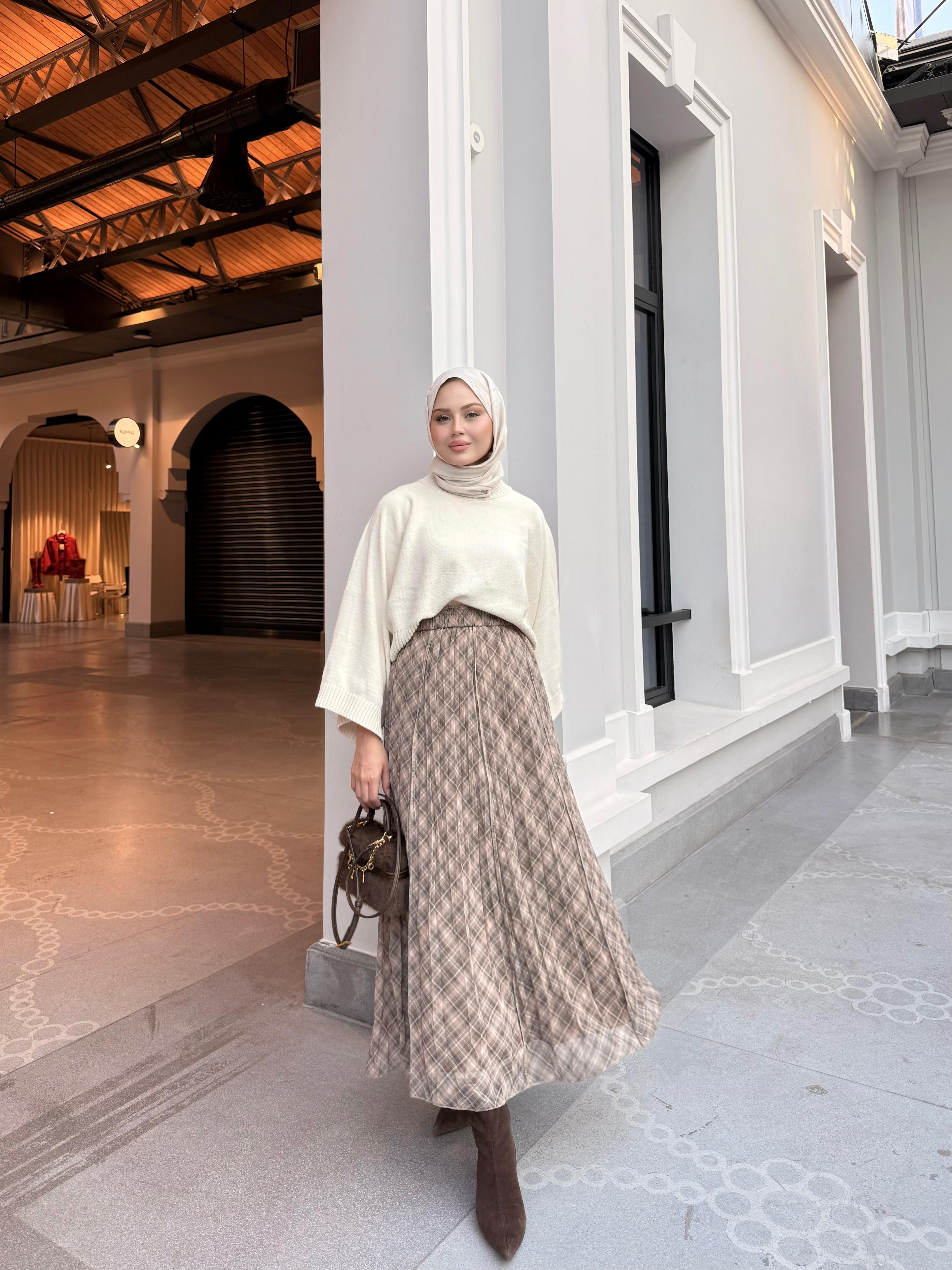 Dikiş Detay Etnik Desen Beli Lastikli Şifon Etek Vizon