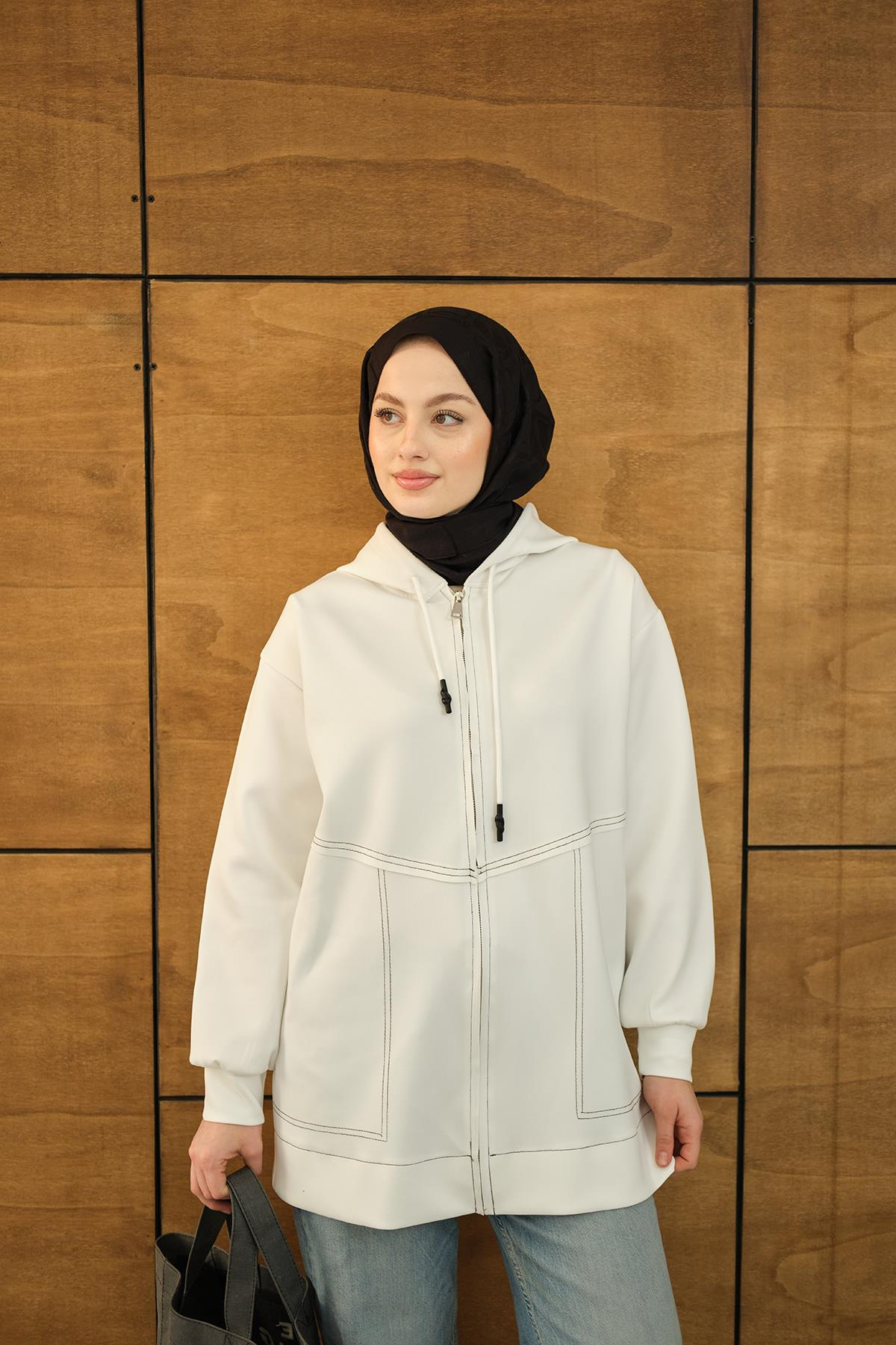 Dikiş Detay Kapüşonlu Hırka Beyaz
