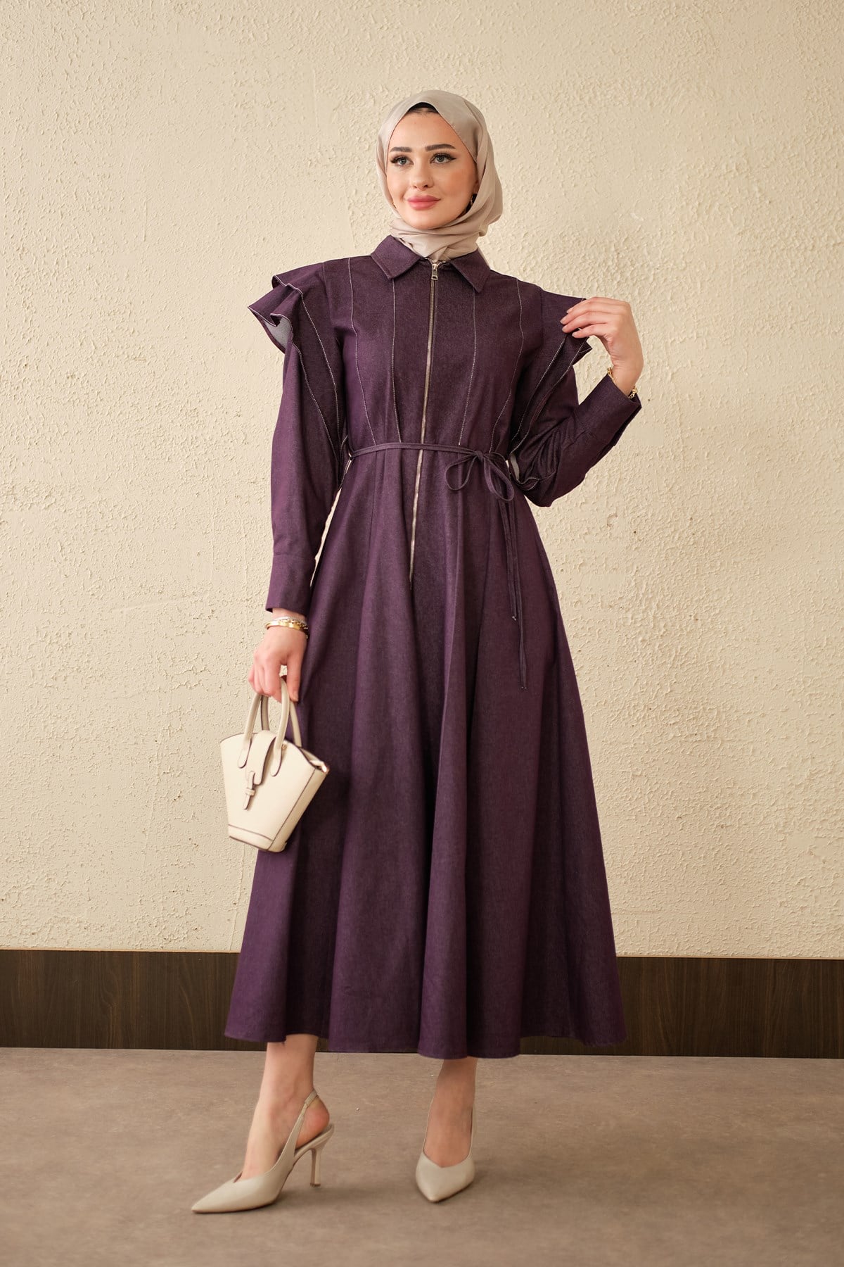 Dikiş Detay Omuz Büzgülü Kot Elbise Mor