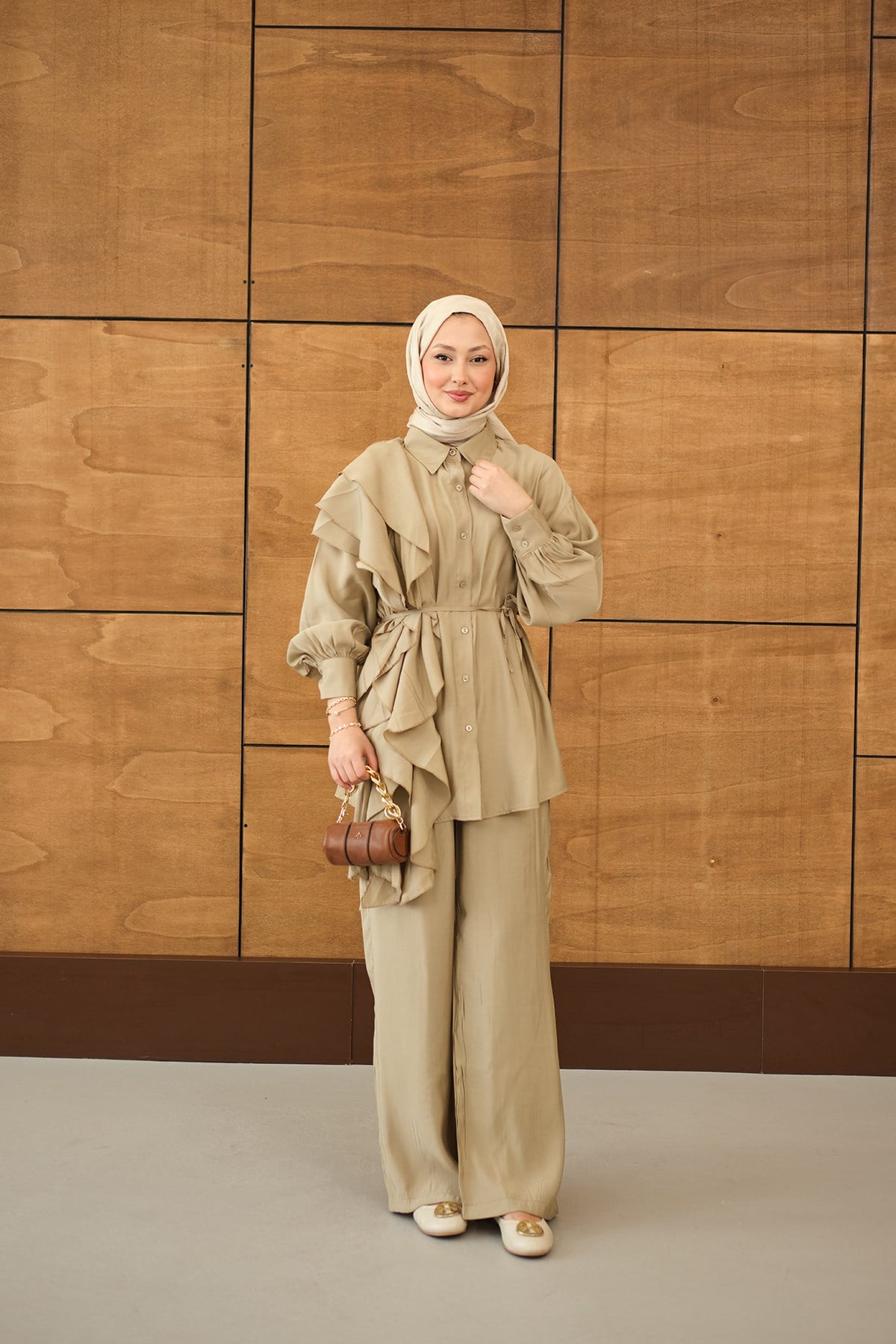 Dikiş Detay Volanlı Bel Bağlamalı Takım Krem
