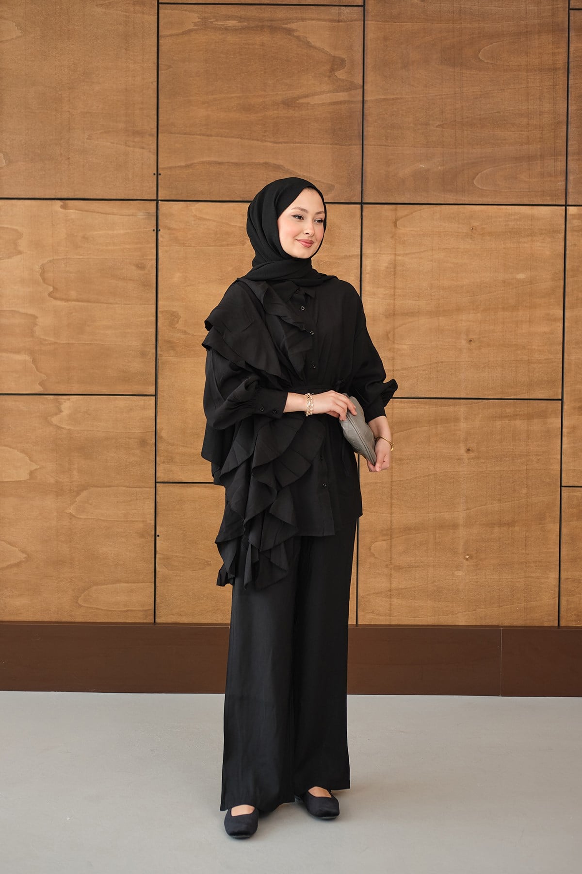 Dikiş Detay Volanlı Bel Bağlamalı Takım Siyah