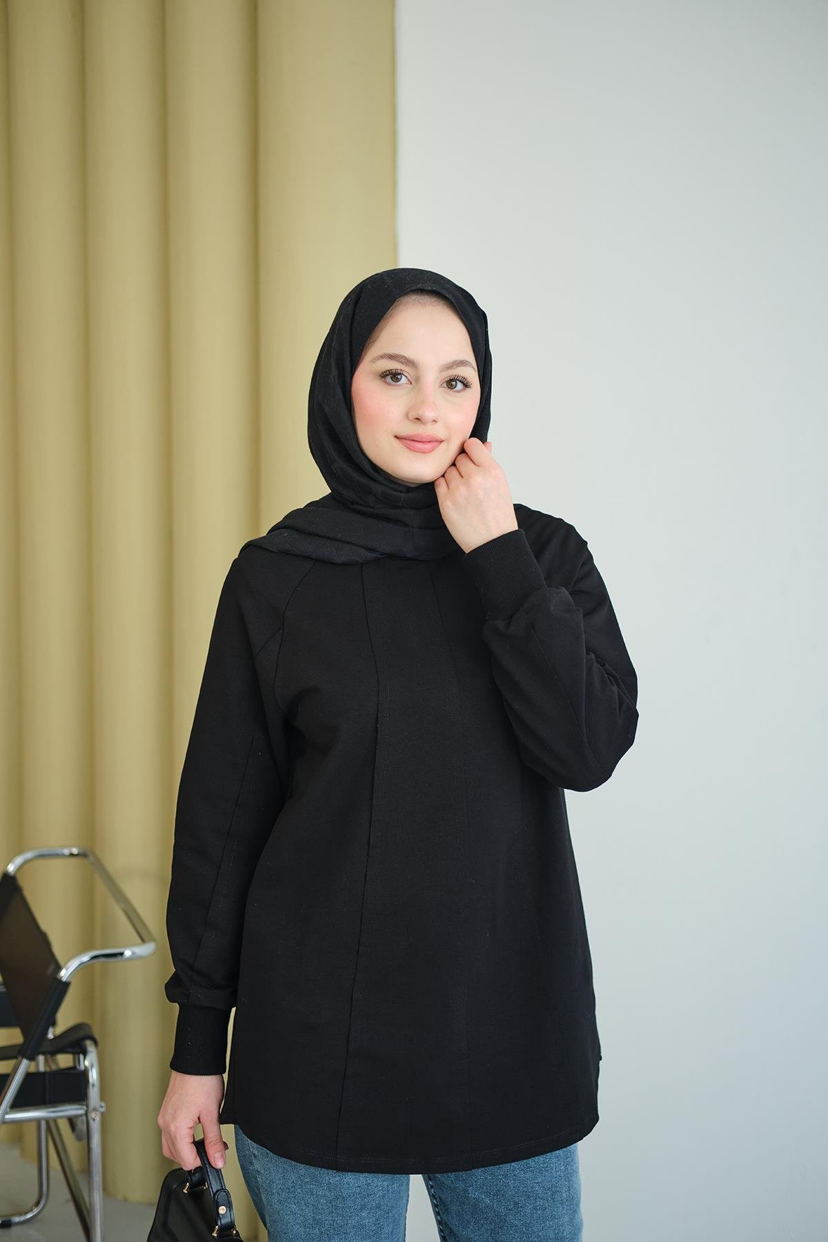 Dikiş Detaylı Bisiklet Yaka Sweat Siyah