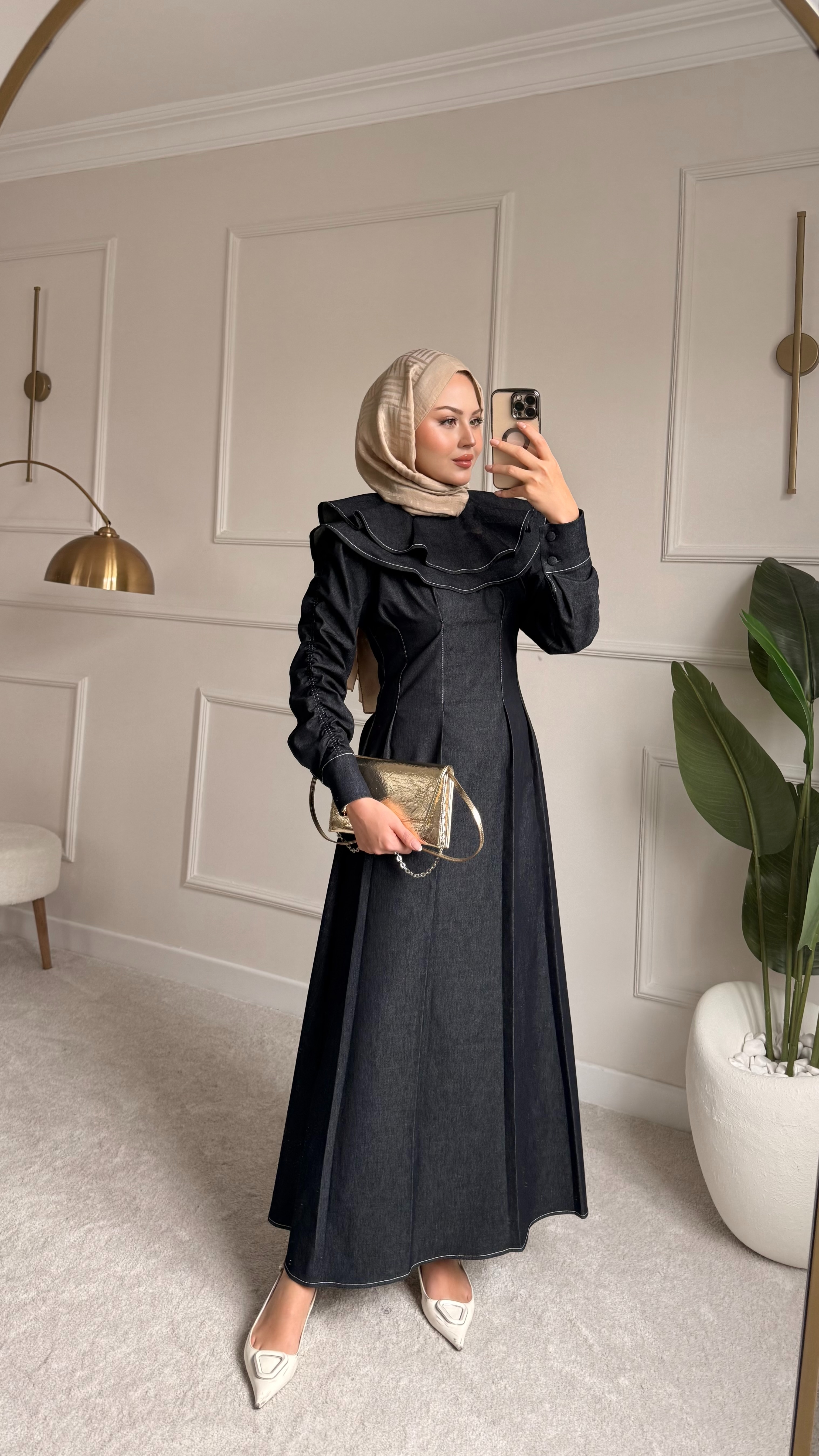 Dikiş İz Detay Pelerinli Kot Elbise Lacivert