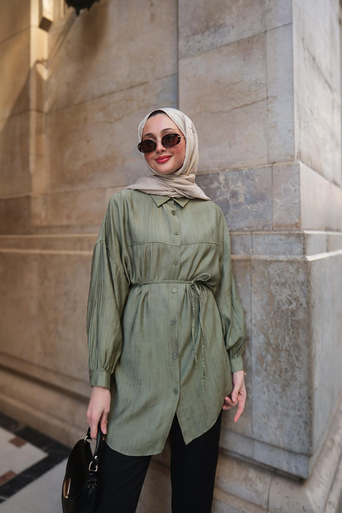 Dokulu Oversize Gömlek Yeşil