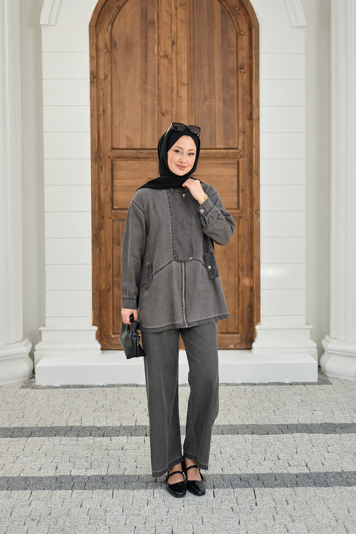 Düğme Detay Gizli Fermuarlı Takım Antrasit