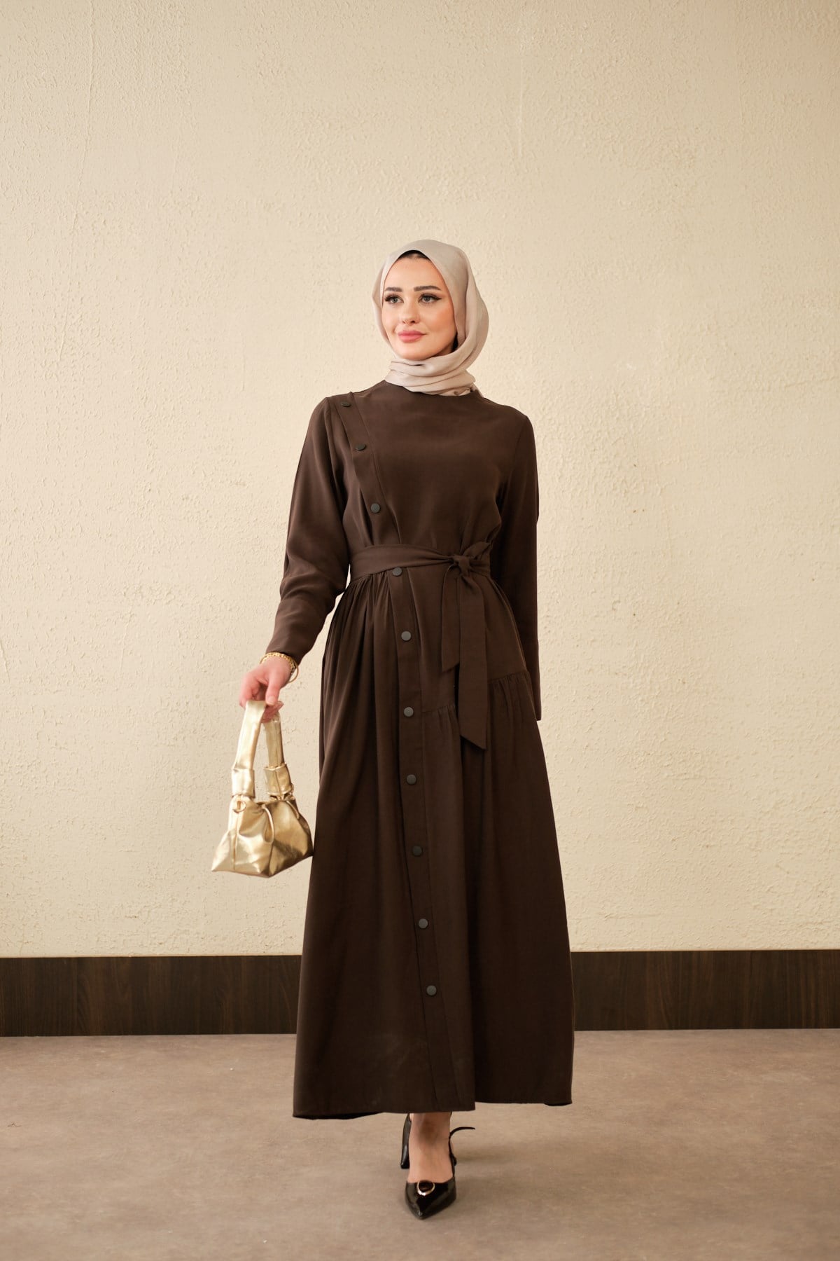 Düğmeli Etek Büzgülü Bel Bağlamalı Elbise Kahverengi