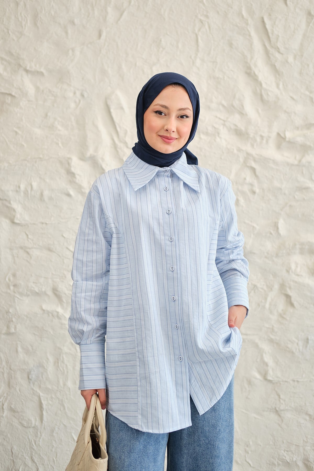Düz Ve Yan Çizgi Detay Gömlek Açık Mavi