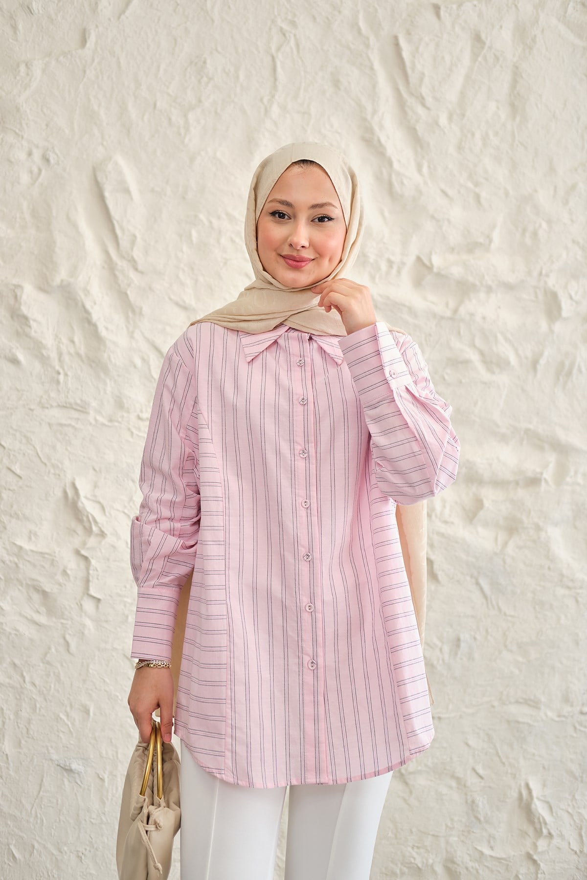 Düz Ve Yan Çizgi Detay Gömlek Pembe
