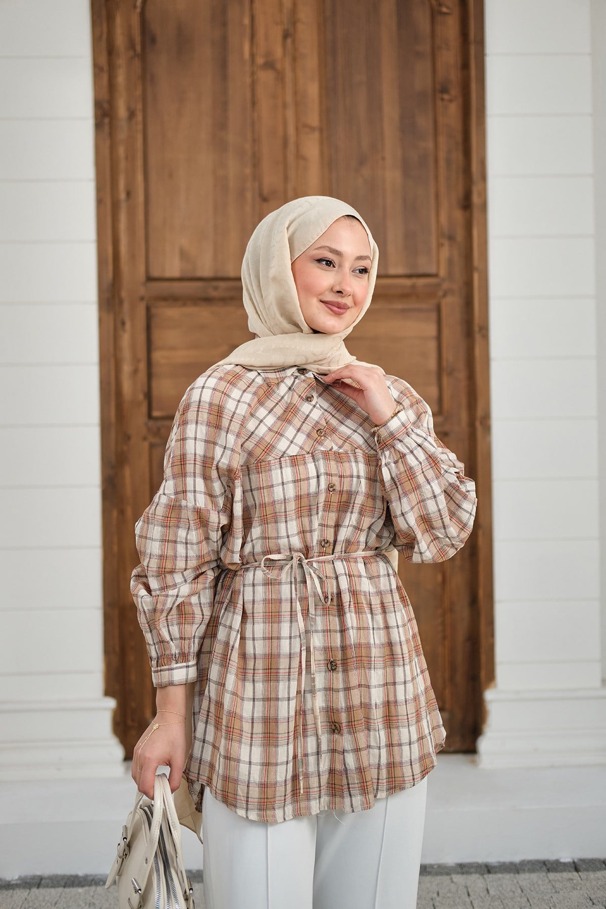 Ekose Desen Bel Bağlamalı Gömlek Vizon