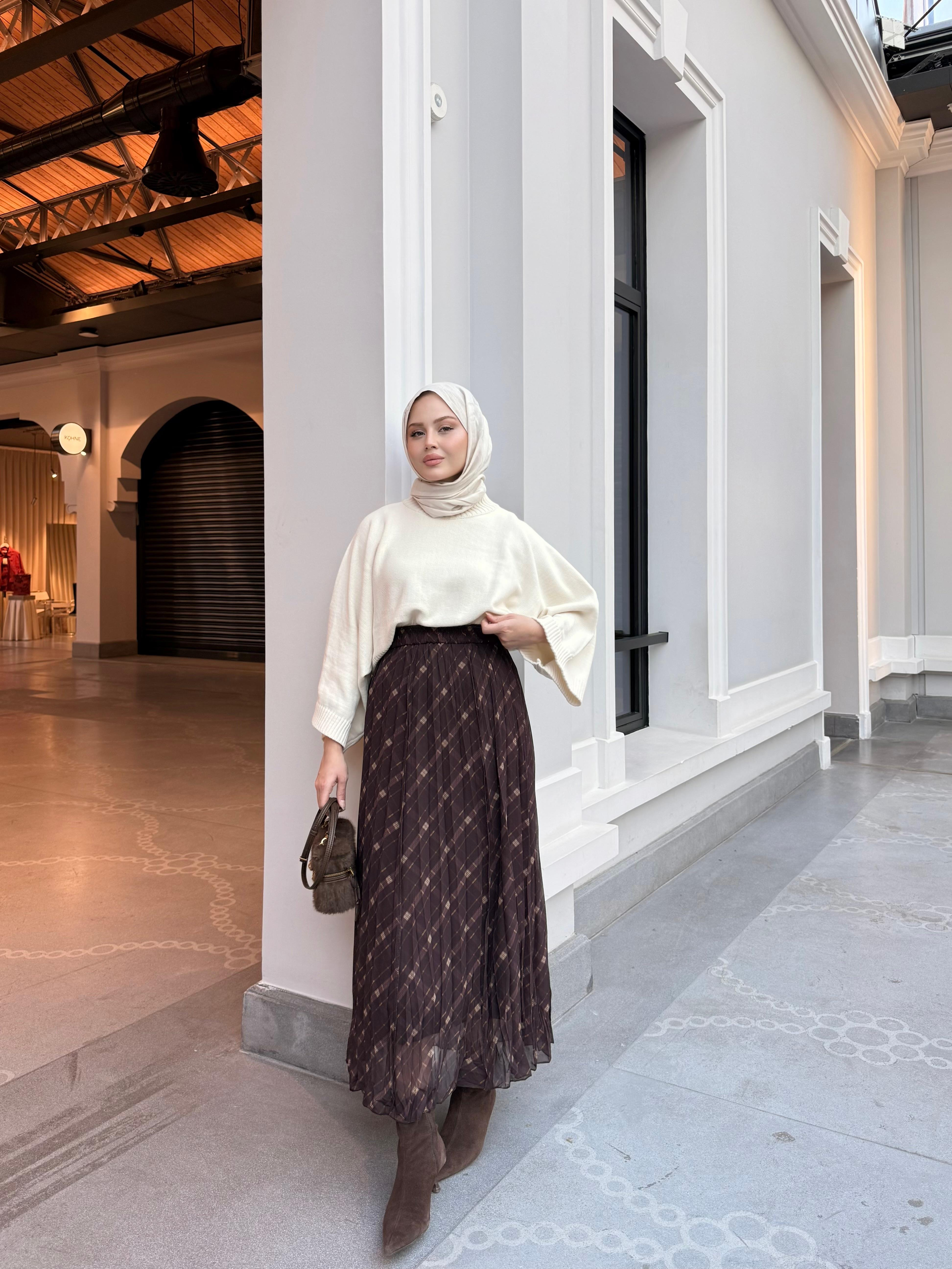 Ekose Desen Bel Lastik Detay Şifon Etek Kahverengi